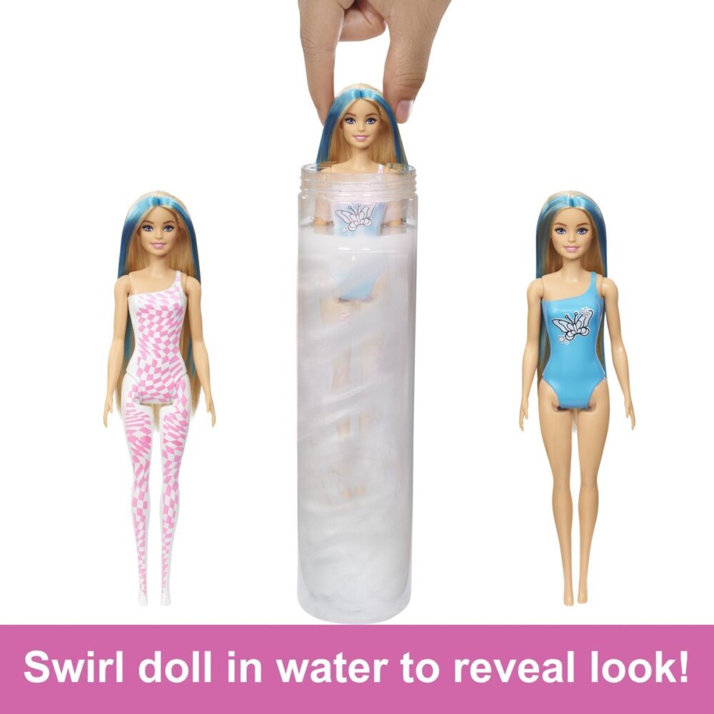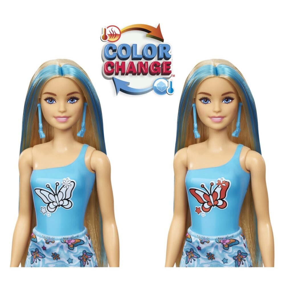 Barbie Color Reveal lutke pružaju iskustvo raspakiranja puno iznenađenja, njih šest! Uz ovu seriju nadahnutu dugom, djeca pronalaze jednu od četiri jedinstvene lutke – svaka ima dugu kosu s pramenom u boji i slatku naljepnicu inspiriranu modom iz 1960-ih. Preobrazite naljepnicu ledeno hladnom i toplom vodom za ponovni wow trenutak! Koju ćete lutku otkriti? Dodaci uključuju suknju s odgovarajućim uzorkom, šarene cipele, cvjetnu četku i elegantne naušnice. Koristite tubu za pakiranje za pohranjivanje ovih i drugih komada. Djeca ih mogu skupljati sve za zabavu miješanja i spajanja. Svaki se prodaje zasebno, ovisno o dostupnosti. Lutke ne mogu stajati same. Boje i ukrasi mogu varirati. Igračka dolazi u više različitih modela, a isporuka ovisi o njihovoj trenutnoj raspoloživosti.