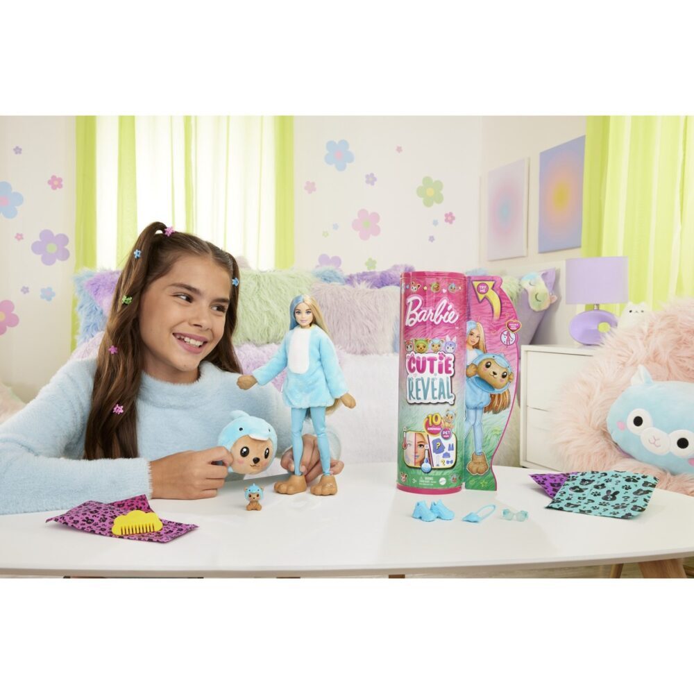 Barbie Cutie Reveal lutke s temom životinjskih kostima nude najslađe iskustvo raspakiranja s 10 iznenađenja! Otkrijte psa kao žabu, plišanog medvjedića kao delfina ili zeku kao koalu. Skinite plišani kostim kako biste otkrili zgodnu lutku Barbie s dugom šarenom kosom i svjetlucavim ukrasima na očima i usnama. Otkrijte još iznenađenja poput para cipela, torbice i odgovarajućeg mini ljubimca. Preokrenite plišani gornji dio za jaknu od flisa i okrenite glavu kostima za krevet za kućnog ljubimca. Ledeno hladna voda dodaje još više ljupkosti s promjenom boje na licu lutke i mini ljubimca; topla voda ih vraća za ponovnu zabavu! Djeca će voljeti otkrivati – i skupljati – sva slatka iznenađenja u ovoj preslatkoj seriji Barbie Cutie Reveal. Svaka lutka prodaje se zasebno, ovisno o dostupnosti. Lutke ne mogu stajati same. Boje i ukrasi mogu varirati.