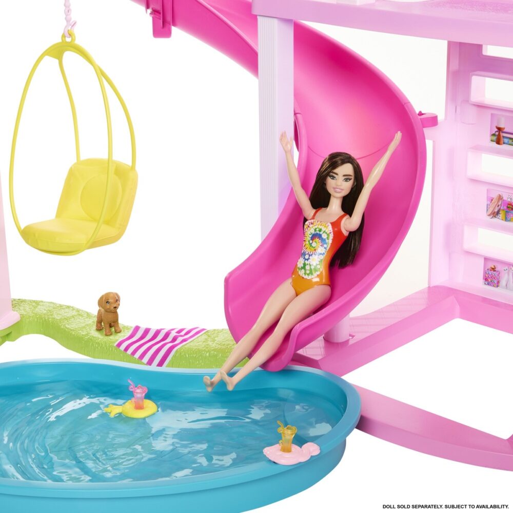 Djeca mogu organizirati **vrhunsku zabavu uz bazen** i nezaboravne prespavance uz **Barbie® Kuću iz Snova na 3 kata**! Ova luksuzna kuća za lutke donosi **najviši tobogan sa spiralnim dizajnom** među svim Barbie kućama, jamčeći sate beskrajne zabave na suncu.