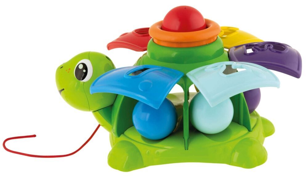 Vesela kornjača ima priloženo 5 raznobojnih loptica koje dijete treba umetnuti u otvor na kornjačinom oklopu. Kada pritisne veliki narančasti krug, sva vrata na oklopu će se otvoriti i kuglice će ispasti van.