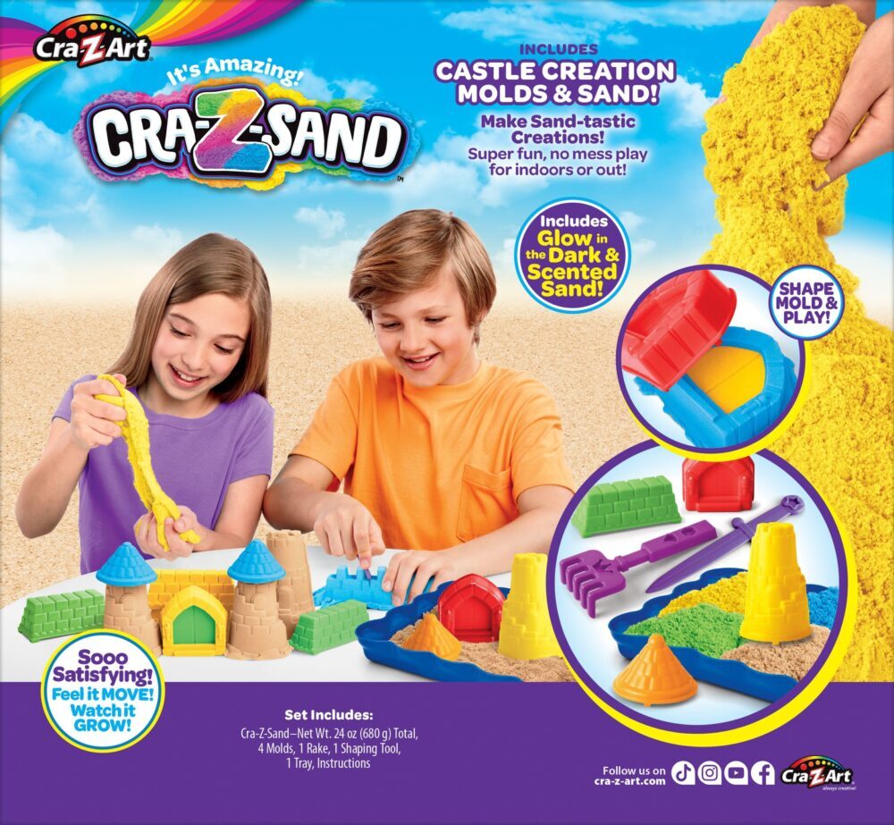 Uživajte u Cra-Z-Sand setu kinetičkog pjeska koji sjaji u tami i miriše!Cra-Z-Sand ostaje zajedno kompaktan kada se oblikuje, pružajući sate i sate kreativne igre. Zabavite se koristeći kalupe za stvaranje cigli, vrata i tornjeva.Dob 4+ god.
