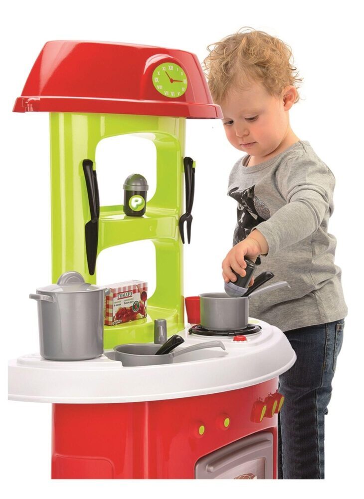Radna površina sa sudoperom, pločom za kuhanje, pećnicom, posuđem, priborom i hranom – sve to u dječjoj kuhinji za pravi doživljaj.