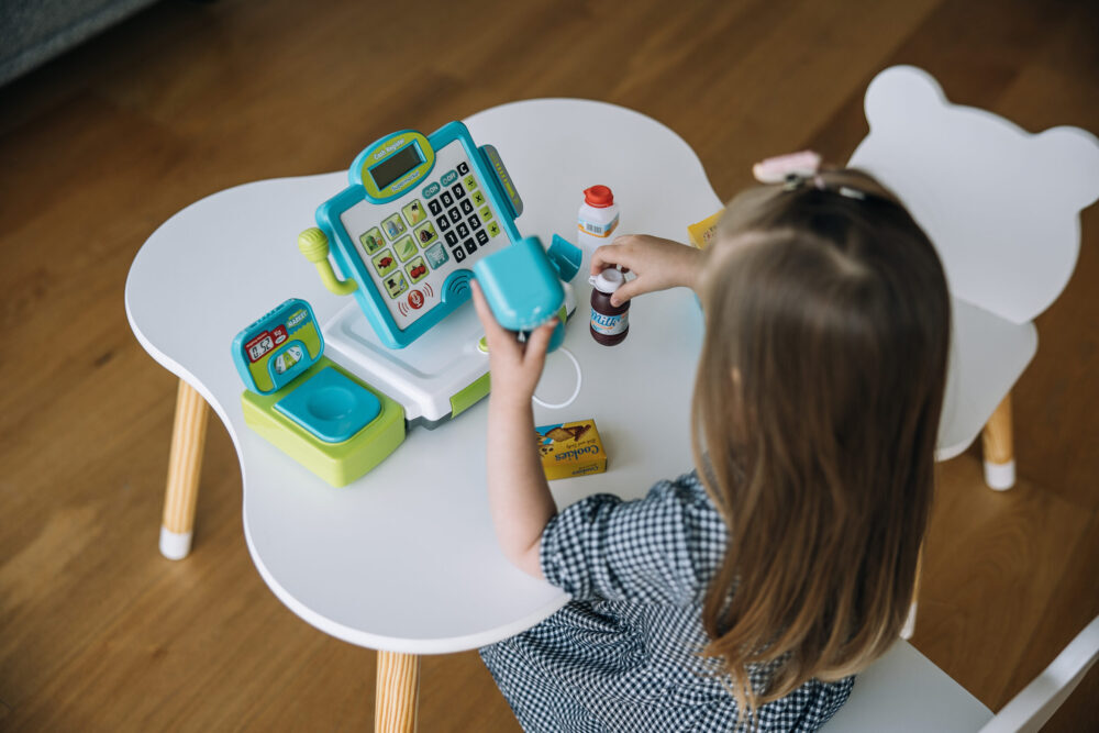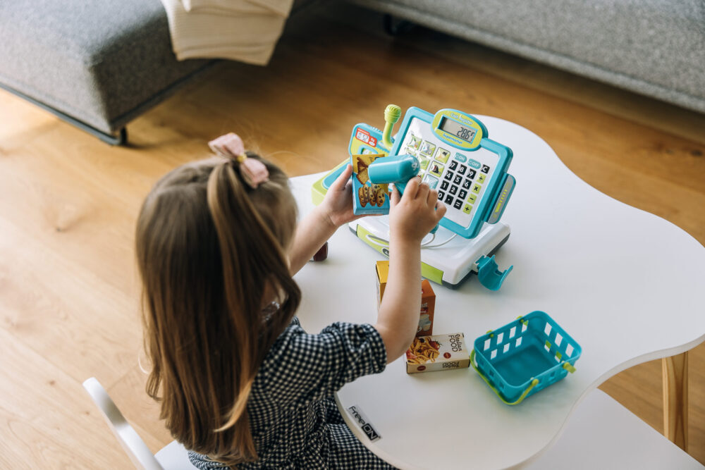 Igranje uloga vrlo je važno za djetetov razvoj jer potiče djetetovu maštu i komunikacijske vještine, a ujedno je i jedna od omiljenih dječjih igara.Dječja blagajna prilagođena je djeci od 3 godine. Radi uz pomoć baterija.Ima: