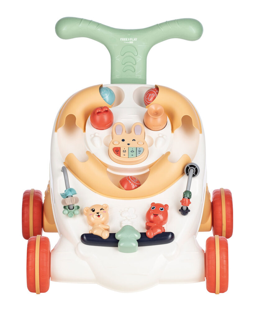 Dizajnirana tako da djetetu pruži sigurnost i podršku prilikom pokušavanja ustajanja i pomaže mu da ne padne na stražnjicu. Budući da je guranje hodalice zabavna aktivnost za djecu, mališani se vole igrati s njom, što može dovesti do toga da prije prohodaju. Korištenje hodalice za igrui guranje za dijete je sigurno i stabilno.Hodalica je neizostavan pomoćnih za kretanje koji djetetu osim oslonca pruža i zabavu. Na prednjoj strani hodalice nalazi se prostor za igru s mnoštvom elemenata, igračaka, loptica i gumbića koji privlače pažnju i animiraju mališana. Atraktivne boje privući će pozornost djeteta, a posebno zanimljiv je skidivi zeko sa svjetlosnim i zvučnim efektima koji reproducira životinjske zvukove, svira prva četiri tona glazbene ljestvice i izgovara četiri engleske fraze.Ono što ovu hodalicu izdvaja od ostalih hodalica na tržištu je mogućnost podešavanja ručke na dvije različite visine. Time možete optimalno prilagoditi visinu hodalice visini djeteta u različitim godinama. Četiri stabilna kotača osiguravaju da se hodalica ne prevrne bez obzira na koju se stranu mališan naslonio. Osim navedenog, na kotače se mogu postaviti kočnice kako hodalica ne bi klizila dok se dijete igra s pločom za igru.