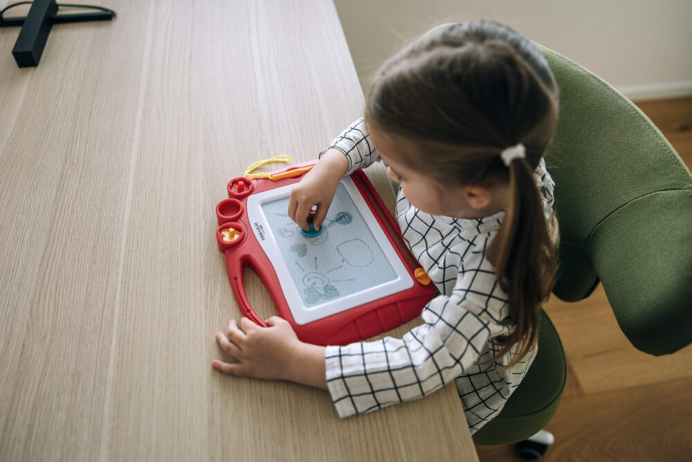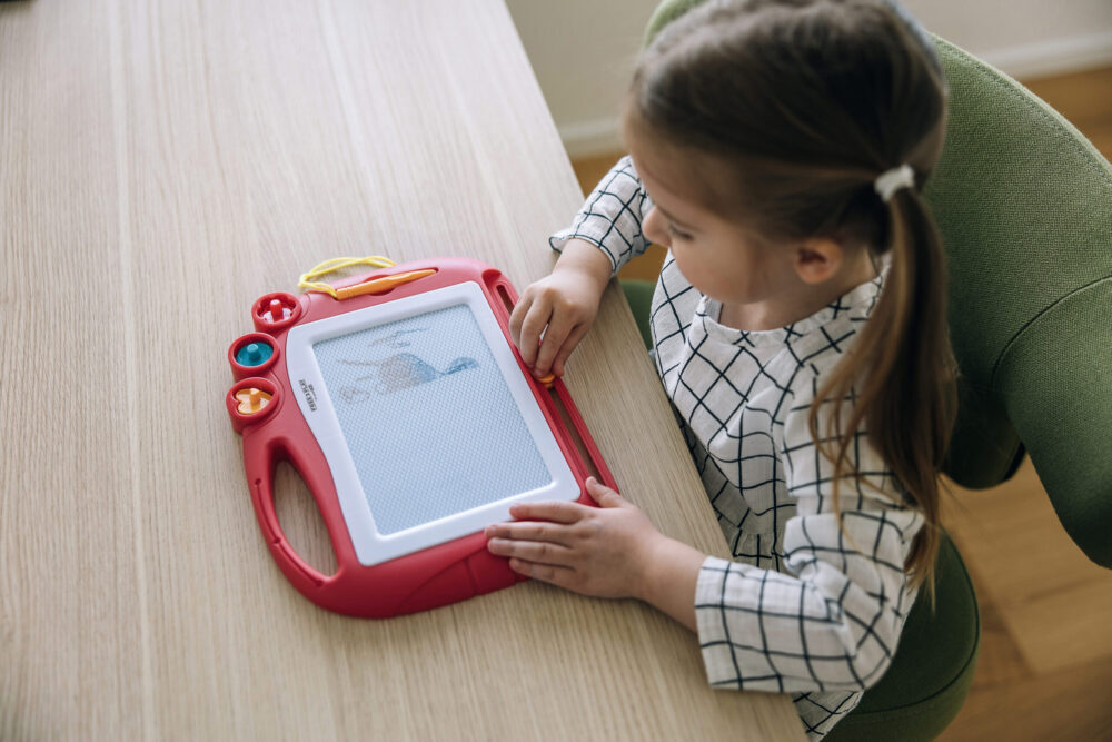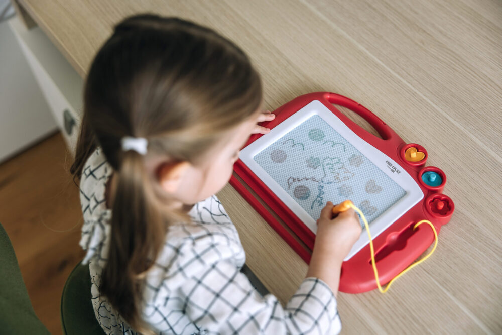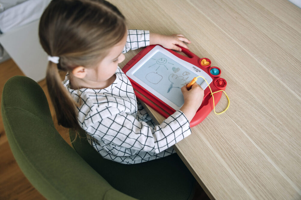 Zabavno stvaranje i učenje uz ploču u boji koja radi na temelju magneta. 3 magnetna pečata različitih oblika i olovka se brišu pomicanjem gumba. Preporučena dob: 36m+ Dimenzije proizvoda: 27,5 x 2 x 21,5 cm Dimenzije pakiranja: 28 x 3 x 22 cm Površina za crtanje: 16,5 x 11 cm