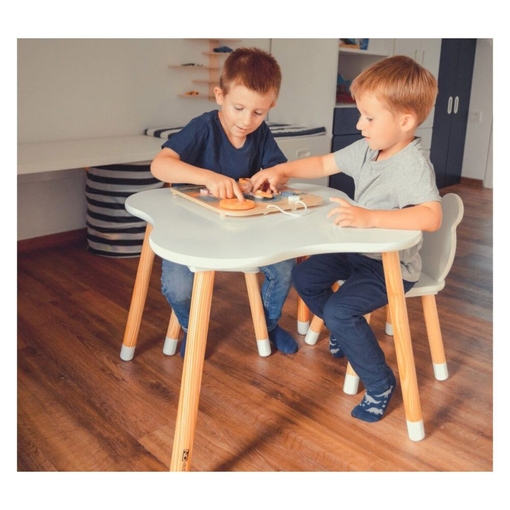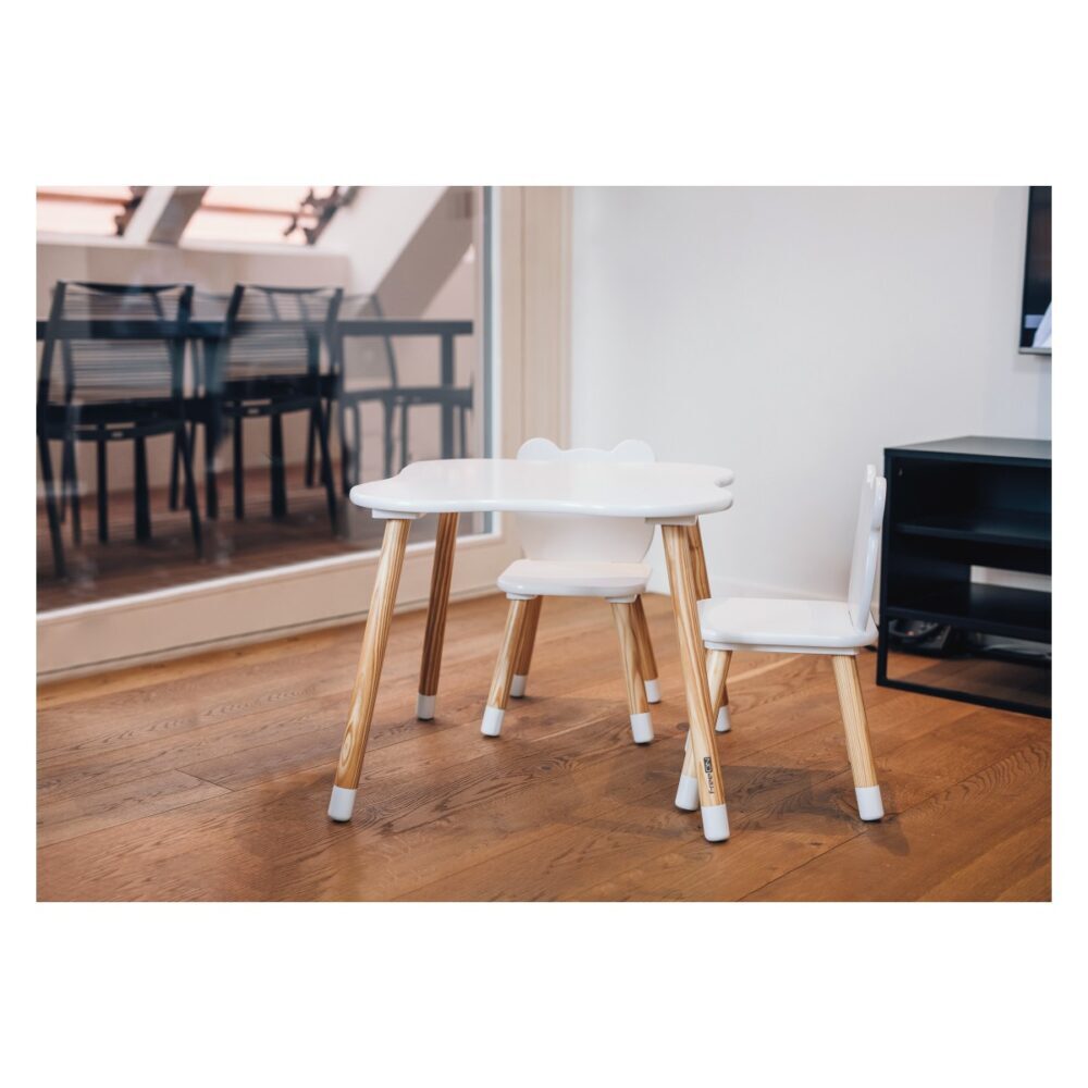 Prekrasan stol sa stolicama u obliku medvjeda, u popularnoj bijeloj natur kombinaciji, lijepo će nadopuniti bilo koju dječju sobu ili igraonicu.