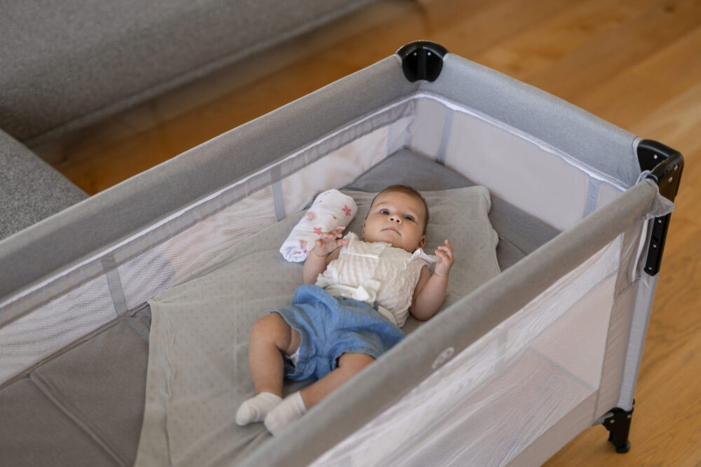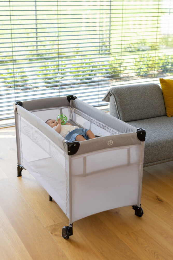 Prijenosni krevetić s pomoćnom stranicom se lagano primakne roditeljskom krevetu. Krevetić ima dva kotačića za jednostavno pomicanje. Dvostruko dno se lagano skida. Prozračna mreža s obje strane krevetića omogućuje prozračnost i cirkulaciju zraka. Pomična stranica se otvara zatvaračem i pomiče pomoću klizača.