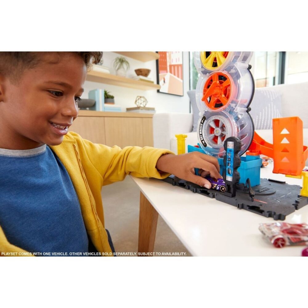 Set uključuje 1 Hot Wheels autić, ali do 4 autića mogu u isto vrijeme biti na pisti u strukturi guma za neprestanu akciju i zanimljivu igru.