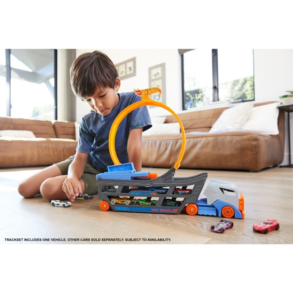 U ovaj super set može se spremiti do 19 autića, ali pogledaj ponovno, ovo nije običan tegljač, ovo je mobilni set za igru – prvi ikada tegljač s krugom!