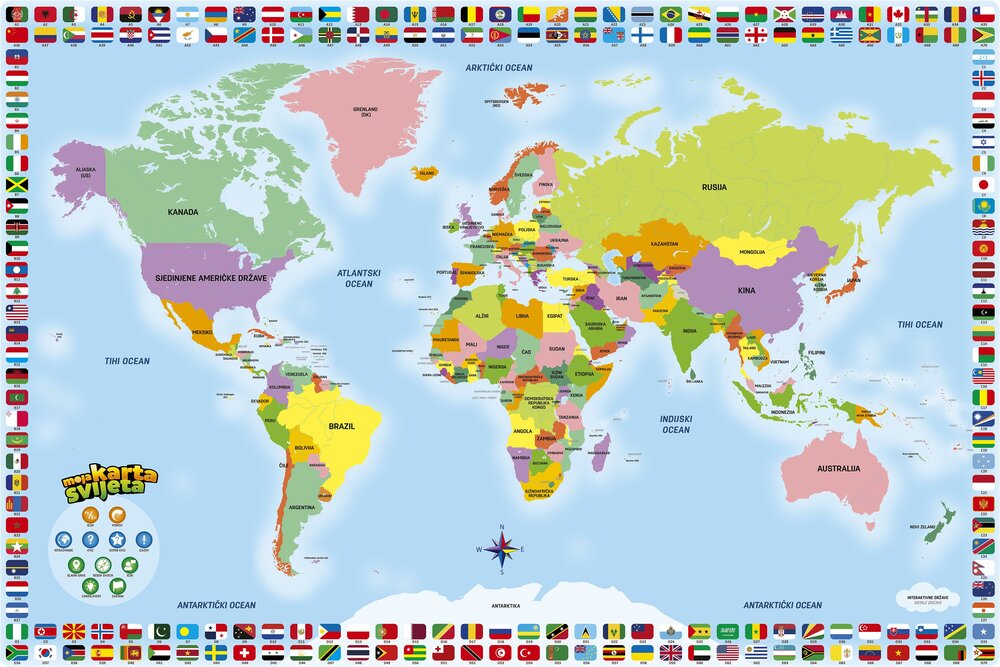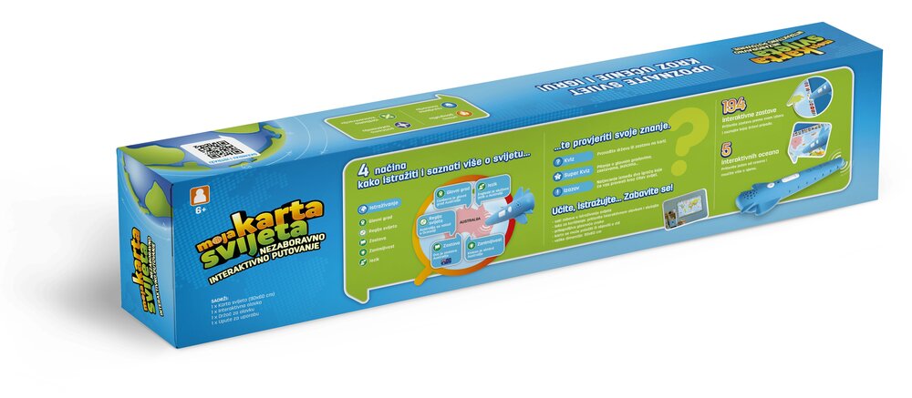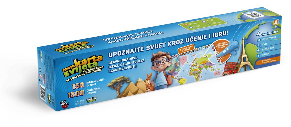 Upoznajte svijet kroz edukativnu igru uz potpuno novu Moju kartu svijeta – edukativnu igru koja je u svojoj prvoj inačici pomogla mnoštvu mališana bolje razumjeti svijet oko sebe. Interaktivna karta sadrži mnoštvo informacija, a uz 4 načina igre zabavnoj igri neće biti kraja. Interaktivna karta je dvojezična (engleski i hrvatski jezik). Uz kartu dolazi i interaktivna olovka pomoću koje igrač istražuje pojmove na karti te odgovara na postavljena pitanja. Set sadrži: 1x interaktivna karta dimenzija 90×60 cm, interaktivna olovka, držač za olovku, upute za uporabu. Baterije: za ispravan rad uređaja potrebne su 2x AAA baterije 1,5 V (nisu uključene uz proizvod). Preporučena dob: 6+.
