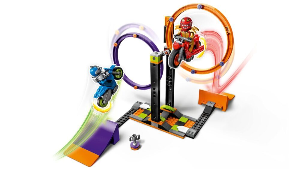 Pripremi se za LEGO® City Vrteći vratolomni izazov! Testiraj svoje vještine, organiziraj epske događaje ili se natječi s prijateljima ili obitelji. Učvrsti obruče, pokreni motocikl na zamašnjak i velikom brzinom zaleti se na rampu da izvedeš savršen skok. Zatim odvoji obruče i zavrti ih da zapapriš izazov. Tko će odnijeti pobjednički trofej? Saznat ćeš. Sretno!