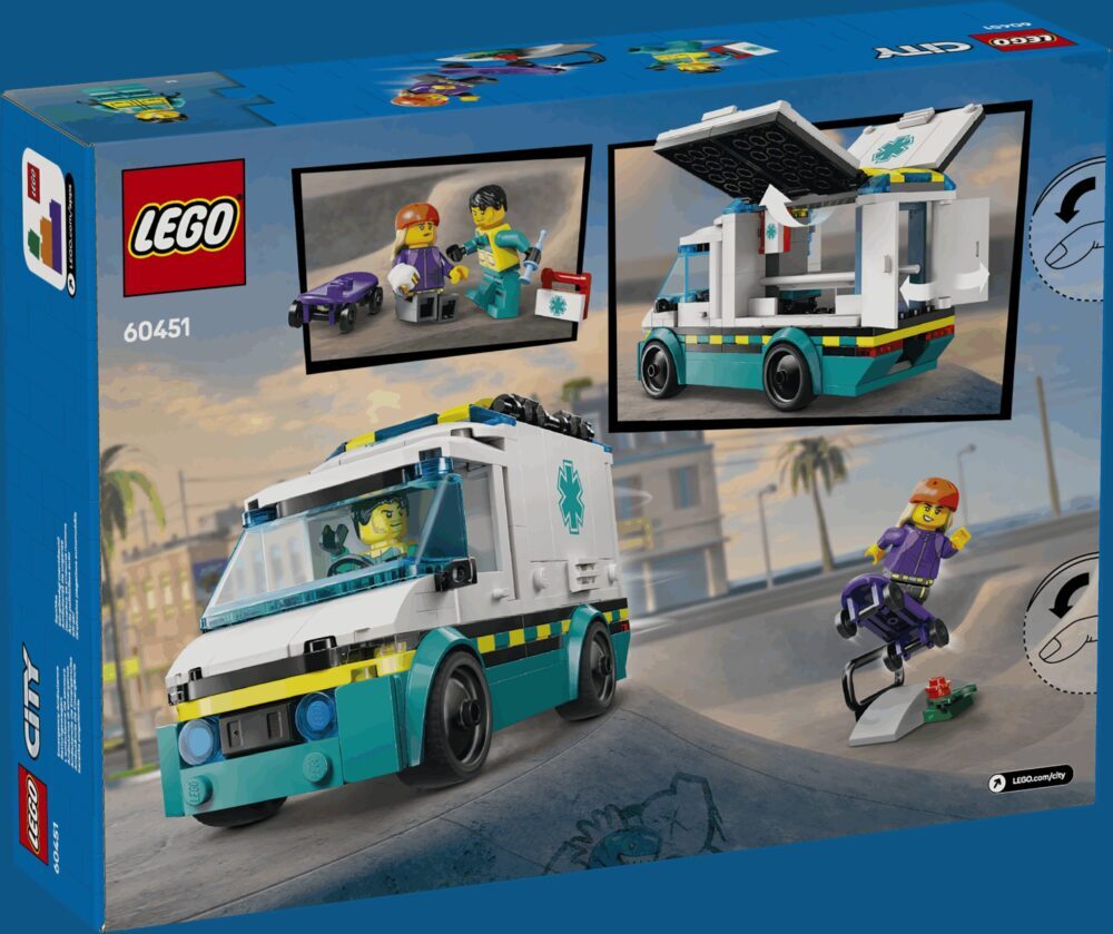 Djeca od 5 godina i starija dobivaju akcijske misije spašavanja u kompletu LEGO® City Kola hitne pomoći (60451). Djeca mogu dignuti bočne ploče i otvoriti stražnja vrata da dođu do nosila i medicinskog pribora, uključujući špricu, zavoj i torbu za prvu pomoć. U kompletu su i skateboard i rampa te figurice skateboarderice i bolničara za zabavnu igru pretvaranja i smišljanje priča. U kompletu za slaganje kola dobivate postupni priručnik i 3D upute u aplikaciji LEGO Builder. U njoj djeca mogu istraživati i spremati komplete, pratiti napredak u slaganju, približavati i okretati modele da ih pregledaju iz svih kutova dok slažu. U kompletima za igru iz linije LEGO City Great Vehicles pronaći ćete igračke za kopno, zrak i vodu za maštovitu igru. Djeca mogu kombinirati komplet s kolima hitne pomoći s drugima iz linije LEGO City (prodaju se zasebno) za još veće pustolovine!