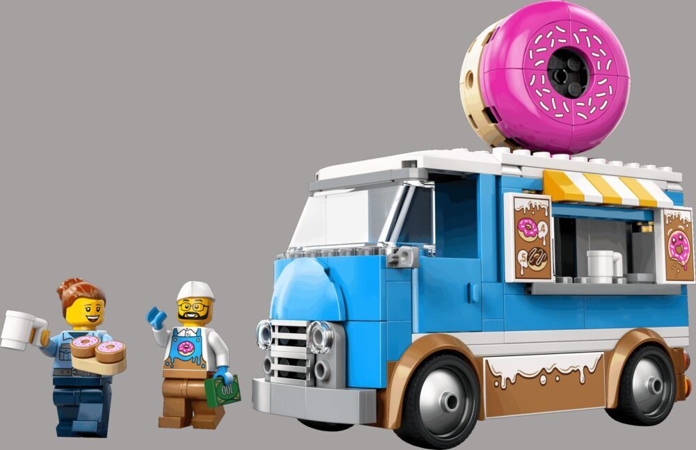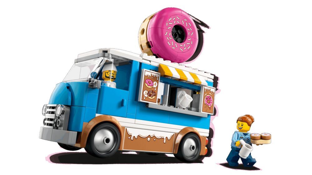 Pripremi kamion s krafnom i kreni prema LEGO® Cityju! Kamion i odvojivi kiosk doista su sjajni! Prouči glazuru na velikoj krafni na krovu. Pripremi ukusne slastice po receptu pa posluži svježe krafne i slasne tople napitke gladnim kupcima. Kad sve prodaš, sjedni za upravljač i odvezi odlični pokretni kafić do sljedećeg odredišta!