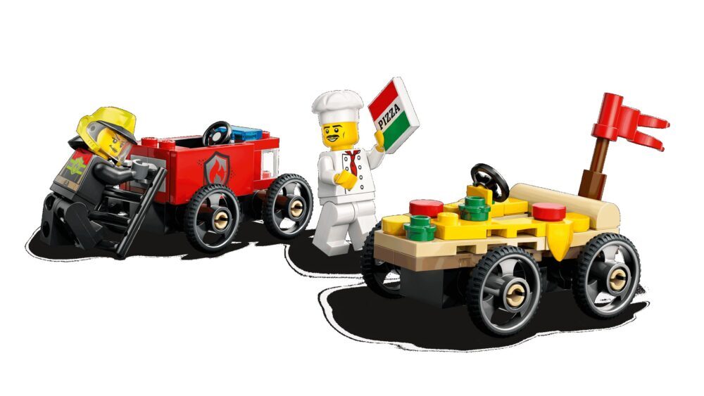 Pripremi se za epski minijaturni obračun u kompletu Auto dostavljača pizze vs. vatrogasno vozilo u utrci. Gradske utrke stižu na ulice LEGO® Cityja, a konkurencija je žestoka! Komad pizze natječe se protiv crvenog vatrogasnog kamiona u sjajnoj utrci! Tko će prvi prijeći ciljnu liniju? Kuhar ili vatrogasac? Pripremi se da stisneš gas i zaškripiš gumama!