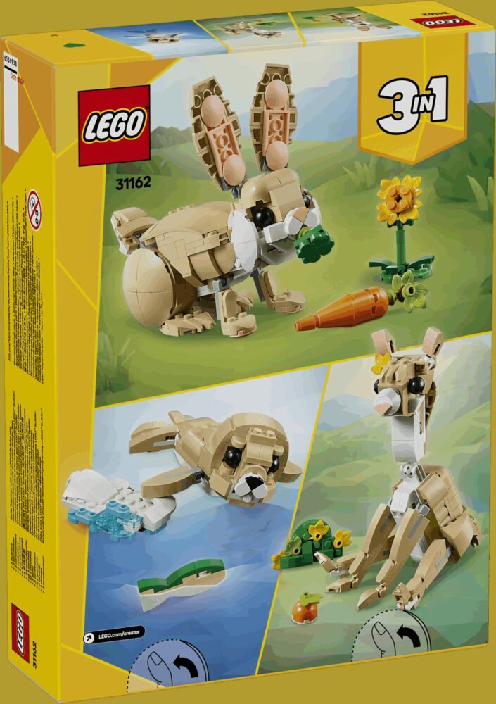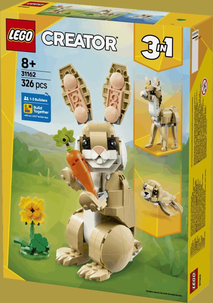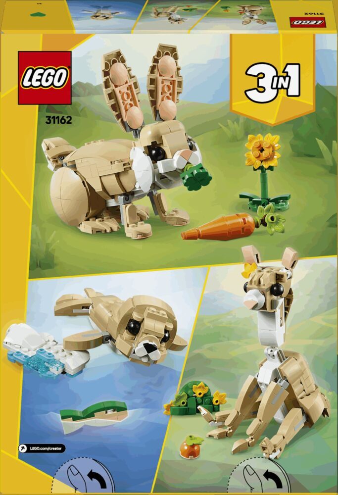 Djeca od 8 godina i starija uživat će u zabavnim pustolovinama u kompletu za slaganje LEGO® Creator 3u1 Slatki zeko (31162). U kompletu sa životinjama dobivaju zeku s pomičnom glavom, ušima, prednjim i stražnjim nogama, koji može stajati na 2 ili 4 noge i grickati suncokret i mrkvu. Djevojčice i dječaci mogu složiti 3 različite životinje od istih kocaka u LEGO kompletu: slatkog zeku sa suncokretom i mrkvom, pomičnu ljamu sa zelenom travom i pola mrkve i tuljana s ledom i ribom. Sva tri prizora odlični su darovi za djecu koja vole maštovitu igru i ukrase. Kompleti LEGO Creator 3u1 potiču dječju maštu jer u svakoj kutiji dobivaju tri različite verzije modela. Uživat će u slaganju i preslagivanju. Mogu slagati s prijateljima i članovima obitelji u zabavnoj zajedničkoj aktivnosti uz aplikaciju LEGO Builder. Imajte na umu da se modeli ne mogu složiti istodobno.