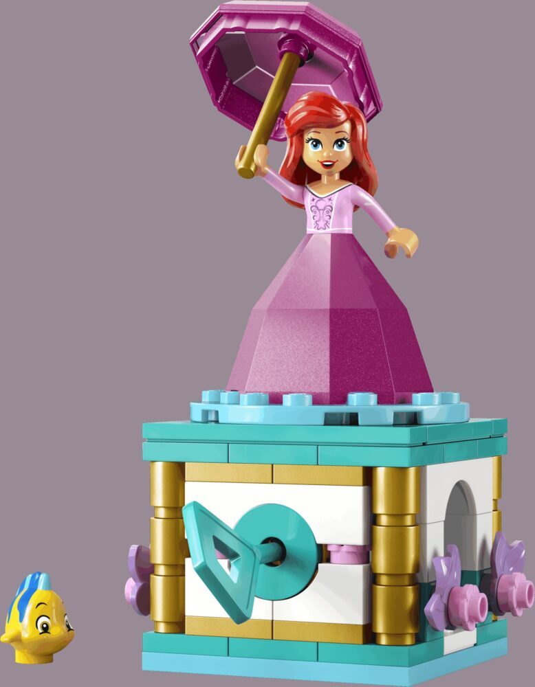 Očarajte djecu i obožavatelje Disneyjeve Male sirene od 5 godina i starije kompletom LEGO® ǀ Disney Ariel pleše (43259) u kojem su složivo postolje s platformom koja se okreće, ključ, vilica i prostor za Floundera te bočni „dijamanti”. Djeca mogu spremiti Ariel u „dijamantnu” haljinu i poklopiti je kišobranom kako bi bila sigurna. Složivi model iz Disneyjeve bajke zabavan je poklon za djevojčice, dječake i obožavatelje filma, odličan je ukras i savršen za kratku, svakodnevnu igru. Djeca će se dobro zabaviti dok se kreativno igraju kompletom za slaganje. Pomoći će im da razviju samopouzdanje i maštu dok sami smišljaju priče. Mogu se igrati samo ovim kompletom ili ga kombinirati s drugima iz linije LEGO ǀ Disney (prodaju se zasebno). Osim toga, djeca mogu uživati u jednostavnoj i intuitivnoj pustolovini slaganja u aplikaciji LEGO Builder, u kojoj mogu približavati i okretati trodimenzionalne modele, spremati komplete i pratiti napredak.
