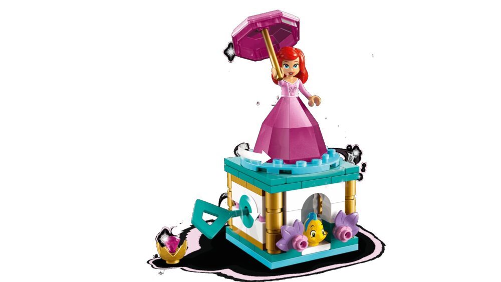Zavrti se s Ariel u „dijamantnoj” haljini! Složi detaljno ukrašeno postolje pa stavi Ariel s kišobranom i vilicom na njega. I Flounder joj može praviti društvo. Okreni ključ da princeza zapleše. Kad se umori, možeš od Arielina kišobrana i haljine napraviti kutiju u obliku dijamanta. Ako želiš još zabave, sakupi i druge princeze u dijamantnim haljinama (prodaju se zasebno) pa se igraj koliko želiš!