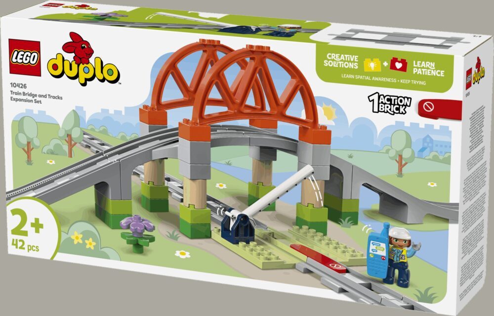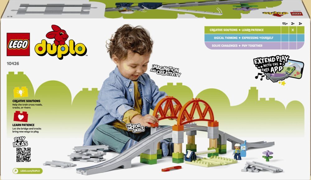Neka dječja igra vlakovima dođe na novu razinu uz komplet Željeznički most i tračnice (10426). Uz kreativnu igračku za slaganje i preslagivanje mališani mogu dodati most interaktivnim željezničkim kompletima LEGO® DUPLO® Town (10427 i 10428, prodaju se zasebno) i iskoristiti 8 ravnih dijelova tračnica koje se mogu povezati sa svim željezničkim kompletima LEGO DUPLO te produljiti put. Tu su i složivi most i rampa koja se podiže. Mališani dobi 2+ zabavit će se dok glume strojovođe i propuštaju vlakove dok vježbaju fine motoričke vještine. Akcijska kocka iz kompleta zaustavlja interaktivne vlakove iz kompleta 10427 i 10428 te proizvodi zabavne zvukove kada joj se približe. Dječja edukativna igračka potiče razvoj male djece. Dok produžuju tračnice preko mosta, usvajaju prostornu svijest. Kombiniranje dijelova tračnica i odlučivanje o odredištu vlaka potiče razvoj vještina predviđanja i rješavanja problema te pomažu mališanima da razviju strpljenje i fokus.