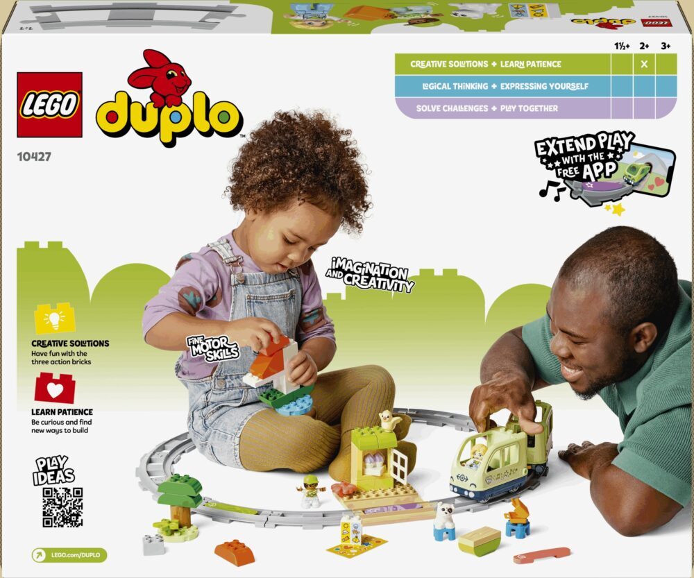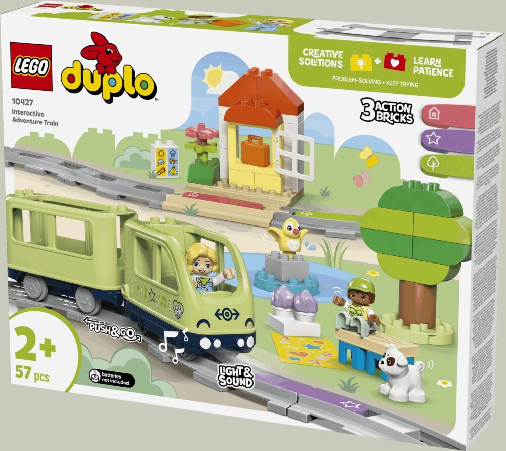 Mališani sjedaju na mjesto strojovođe u igrački za predškolsku djecu Interaktivni pustolovni vlak (10427). Uz model vlaka za djecu dobi 2+ predškolska djeca odlučuju o odredištu obiteljskog izleta, a onda kreću na putovanje puno svjetala, zvukova i novih informacija. Igračka za slaganje i preslagivanje ima mnogo kocaka za slaganje parka, plaže, željezničke postaje ili obiteljskog doma, pa mališani razvijaju znatiželju i kreativnost u slaganju. Edukativna igračka potiče strpljenje mališana i pomaže im da usavrše fine motoričke vještine i kreativnost dok su usredotočeni na slaganje tračnica i odlučivanje o smjeru putničkog vlaka. Igra oživljava uz pomoć 3 akcijske kocke zahvaljujući kojima vlak proizvodi realistične zvukove dok ih prelazi, a mališani razvijaju vještine predviđanja jer mogu pogađati koji će zvuk vlak proizvesti. Mogu upotrijebiti i posebnu kocku za prilagodbu te pustiti zvukove koje su sami snimili u besplatnoj aplikaciji LEGO® DUPLO® Interactive Trains, kojom mogu i voziti vlak koristeći se prijenosnim elektroničkim uređajem.