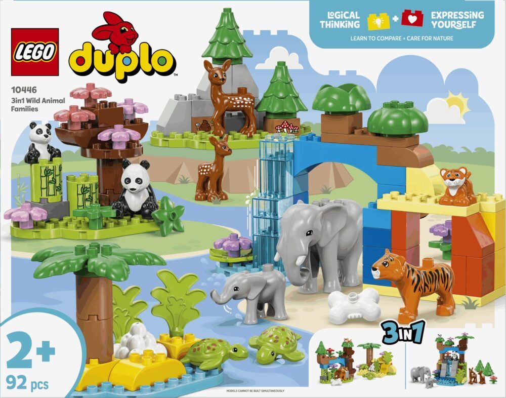 Tražite poklon za predškolsko dijete koje voli životinje? Mališani kreću na pustolovno putovanje svijetom uz igračku Obitelji divljih životinja 3u1 (10446).Igračka za učenje puna je edukativnih elemenata i sadržava 10 LEGO® DUPLO® figura životinja. Mala djeca u kompletu dobivaju prizor iz savane u kojoj tigrica i njezino mladunče jedu kost pa se igraju na stijenama, a slon vodi svoje mladunče do vodopada. Mališani koriste fine motoričke vještine dok pričvršćuju malog slona za rep odrasloga. Kornjače polažu jaja na plaži. U šumi se panda i mladunče igraju pod cvijetom trešnje, dok lijepi jeleni pasu na proplanku. Mališani koji vole igračke s temom prirode usavršavaju mnogo vještina. Uz igračku za povezivanje i razvrstavanje mogu spajati mladunce s roditeljima, uspoređivati ih pa odlučiti što mogu pojesti. Pokazuju kreativnost kad na bezbroj načina mijenjaju LEGO DUPLO komplet 3u1, a maštu dok se brinu o životinjama.