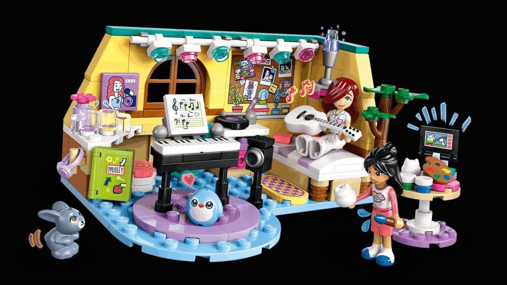 Poklonite djeci od 6 godina i starijoj priliku da smisle vlastite priče o prijateljstvu u kompletu LEGO® Friends Paisleyina soba (42647) za djevojčice, dječake i sve mlade obožavatelje glazbe i umjetnosti. Komplet je pun prilika da se prijateljice Liann, koja voli slikarstvo, i Paisley, koja voli glazbu, druže i pokažu kreativnost. Uz 2 lutkice iz serije LEGO Friends, dobivate i figuru zečice i posebnu „plišanu” LEGO igračku. Djeca mogu odglumiti priču o Paisley i Liann koje uče bojiti figurice gledajući videovodič na tabletu. Mnogo je elemenata za glazbenu igru pretvaranja, kao što su Paisleyna gitara, mikrofoni, zvučnici i drugi, pa je komplet odličan dar za ljubitelje glazbe. Komplet pomaže djeci da razviju socijalne i emocionalne vještine. Mogu nahraniti zečicu Melody elementima hrane i pića pa pronaći tajni odjeljak kreveta u kojem Paisley drži dnevnik. Pronađite i druge zabavne komplete iz svijeta LEGO Friends (prodaju se zasebno) s još mnogo priča i likova.