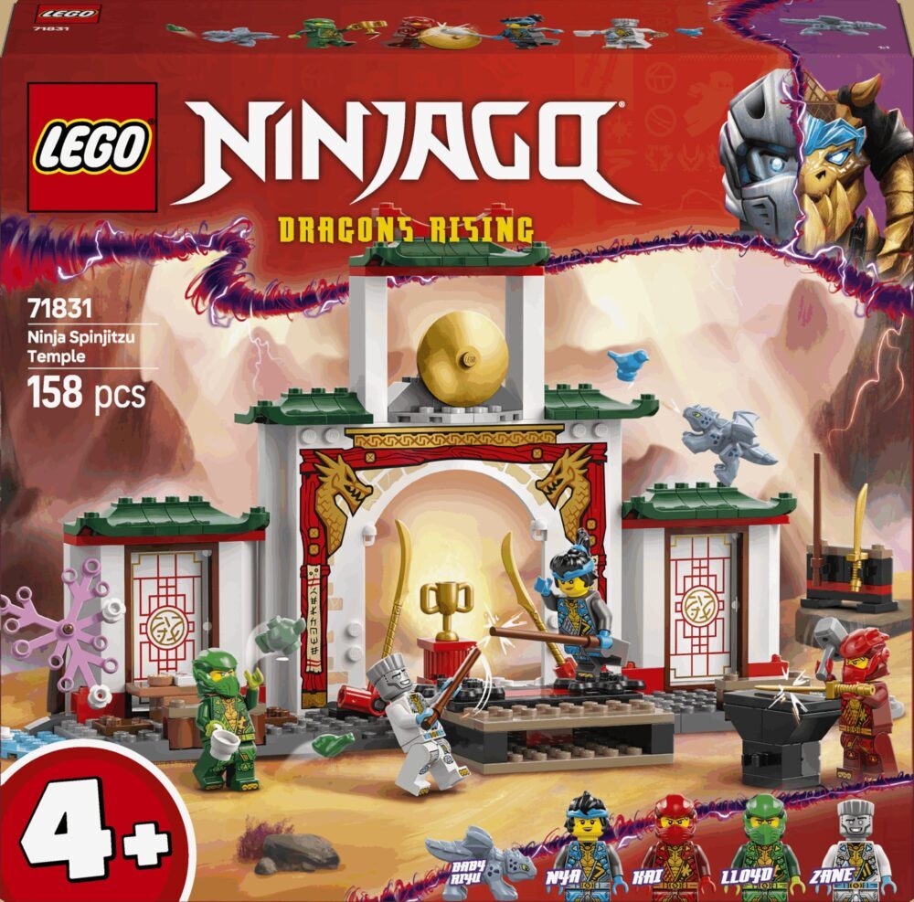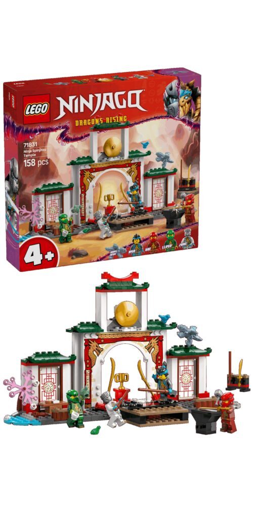 Obradujte djecu koja vole igračke s ninjama kompletom LEGO® NINJAGO® Hram spinjitzua i ninje (71831). U kompletu igračaka sa zmajem djeca od 4 godine i starija mogu odglumiti pustolovine iz 3. sezone televizijske serije NINJAGO® Dragons Rising. Komplet s ninjama idealan je za igru pretvaranja jer ima pozornicu za turnire NINJAGO, vrt, čajanu i oružje u prostoru za trening. U LEGO kompletu dobivate 4 LEGO figurice, Zanea, Nyju, Kaija, Lloyda i figuru bebe Riyua, pa djeca mogu odglumiti akciju s ninjama. Mogu staviti figurice na 2 okretne platforme za epske bitke, a igra je još zanimljivija zahvaljujući raznim dodacima: oružje ninja, među kojim su 2 mača i 3 štapa, čekić, ptica, žaba, pokal, kolač i pismo. Igračka s ninjama osmišljena je tako da bude zabavna djeci dobi 4+ koja tek otkrivaju užitak slaganja LEGO kocaka. Pustolovna igračka ima početničku kocku, djelomično sastavljenu bazu na kojoj djeca mogu brzo i sigurno slagati.