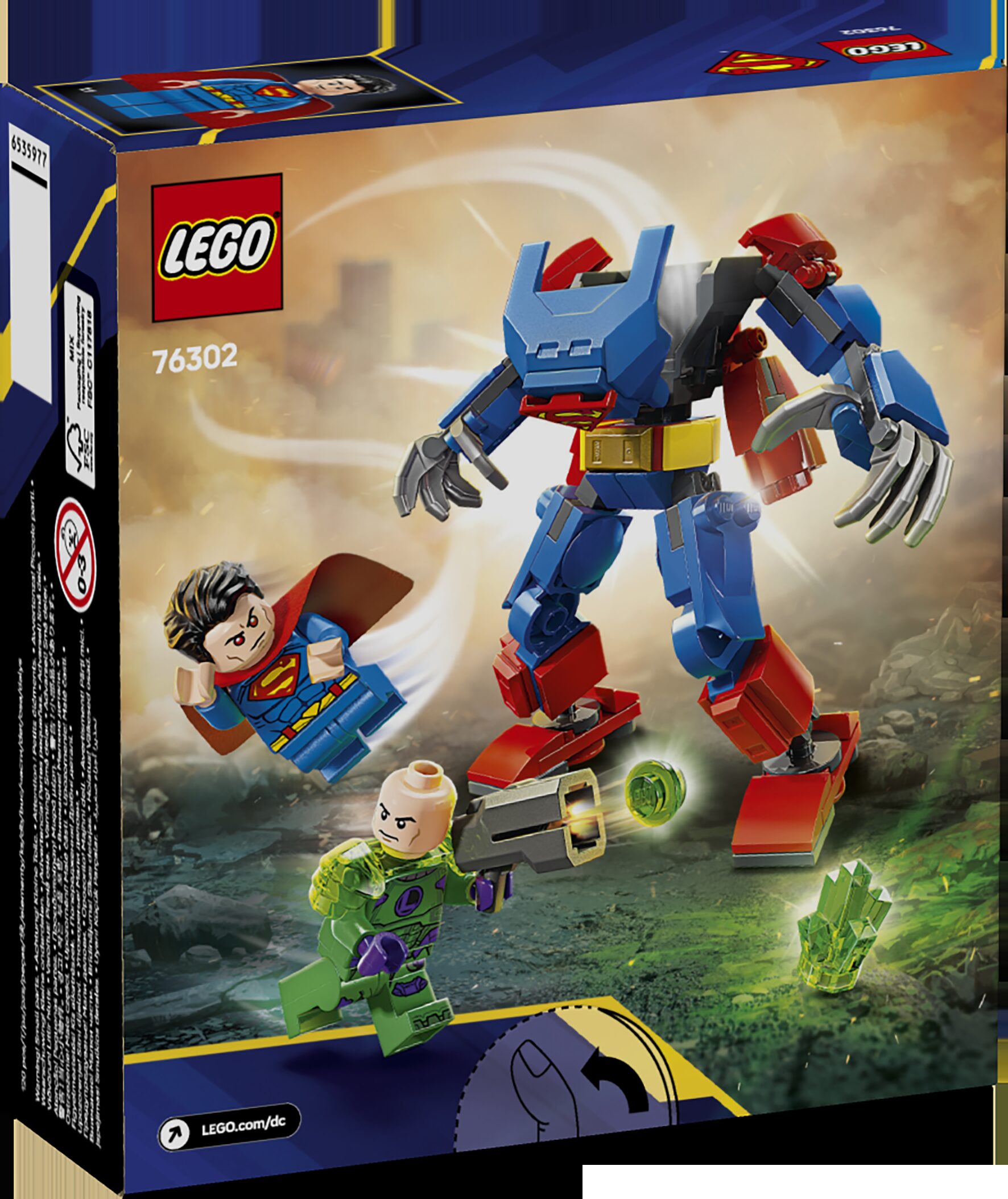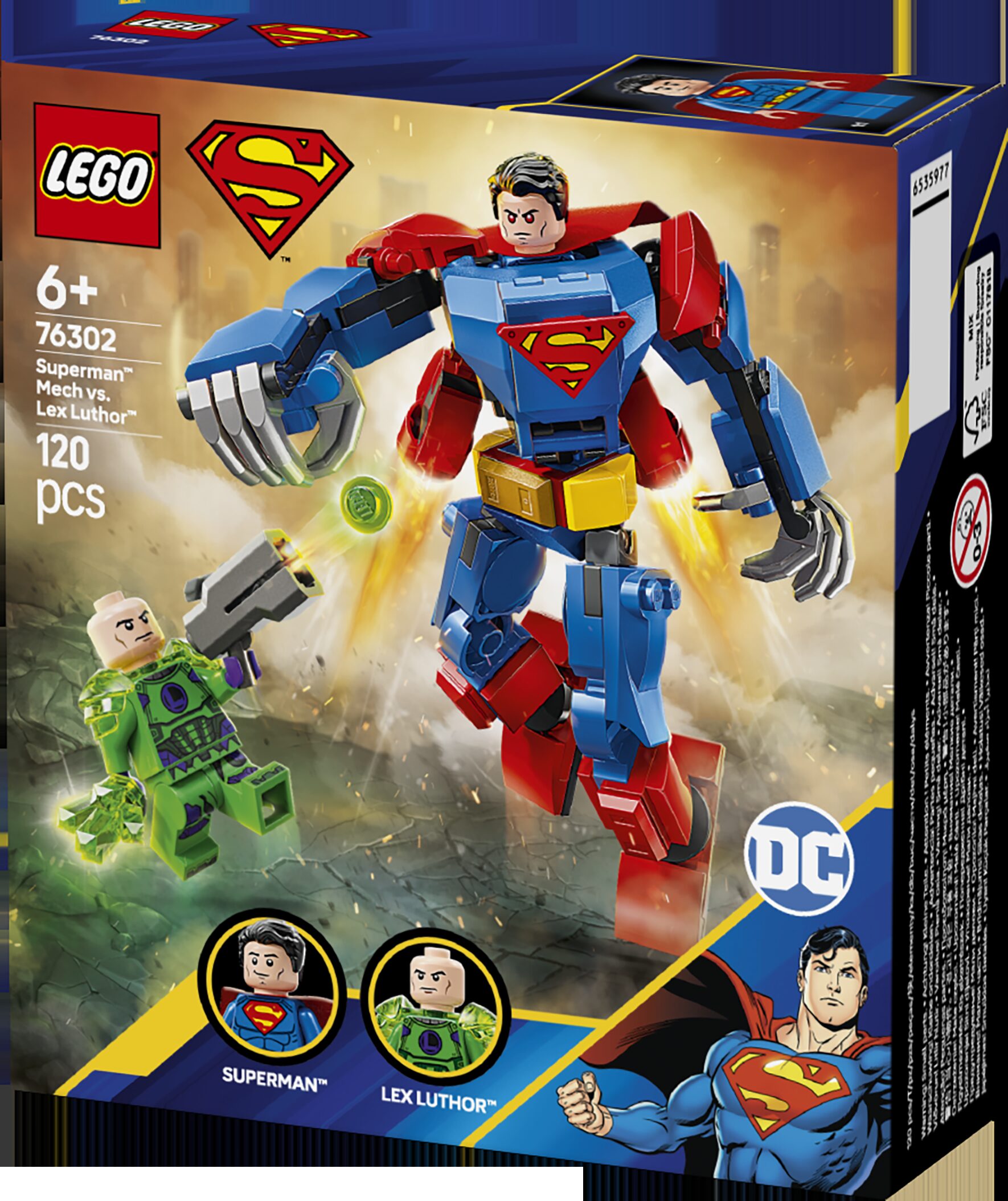 Mehanički Superman™ protiv Lexa Luthora™ (76302) vrhunski je komplet za igru iz linije LEGO® DC za obožavatelje superjunačke akcije i aktivnih pustolovina od 6 godina i starije. U kompletu za igru LEGO DC sa Supermanom dobivate 2 figurice: Supermana s tekstilnim plaštem i okretnom glavom s različitim izrazima lica te Lexa Luthora s pucačem i kristalom kriptonita™. Složivi robot ima pomične ruke, noge i prste. U trupu koji se može otvoriti nalazi se kabina za figuricu Supermana. Na leđa robota postavljena su 2 podesiva potisnika, pa robot može „letjeti”. Ako graditelji traže dodatnu digitalnu zabavu, mogu približavati i okretati trodimenzionalne modele i pratiti napredak u zabavnoj i intuitivnoj aplikaciji LEGO Builder.