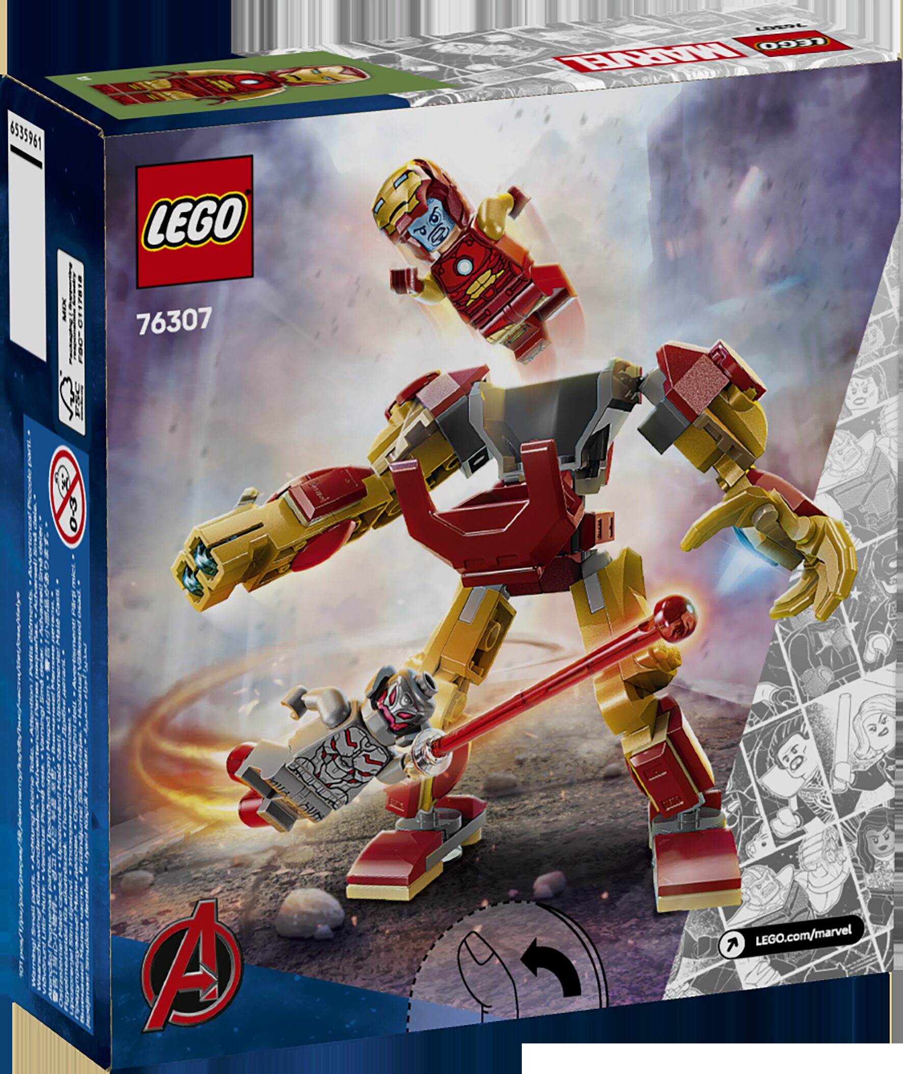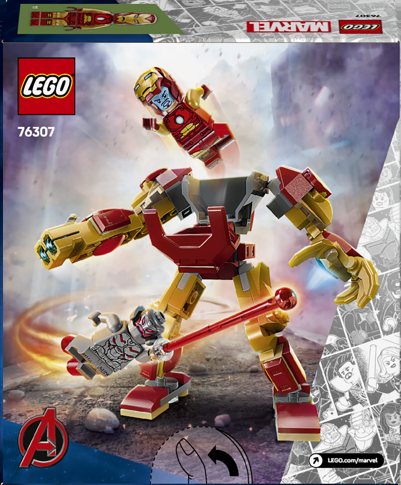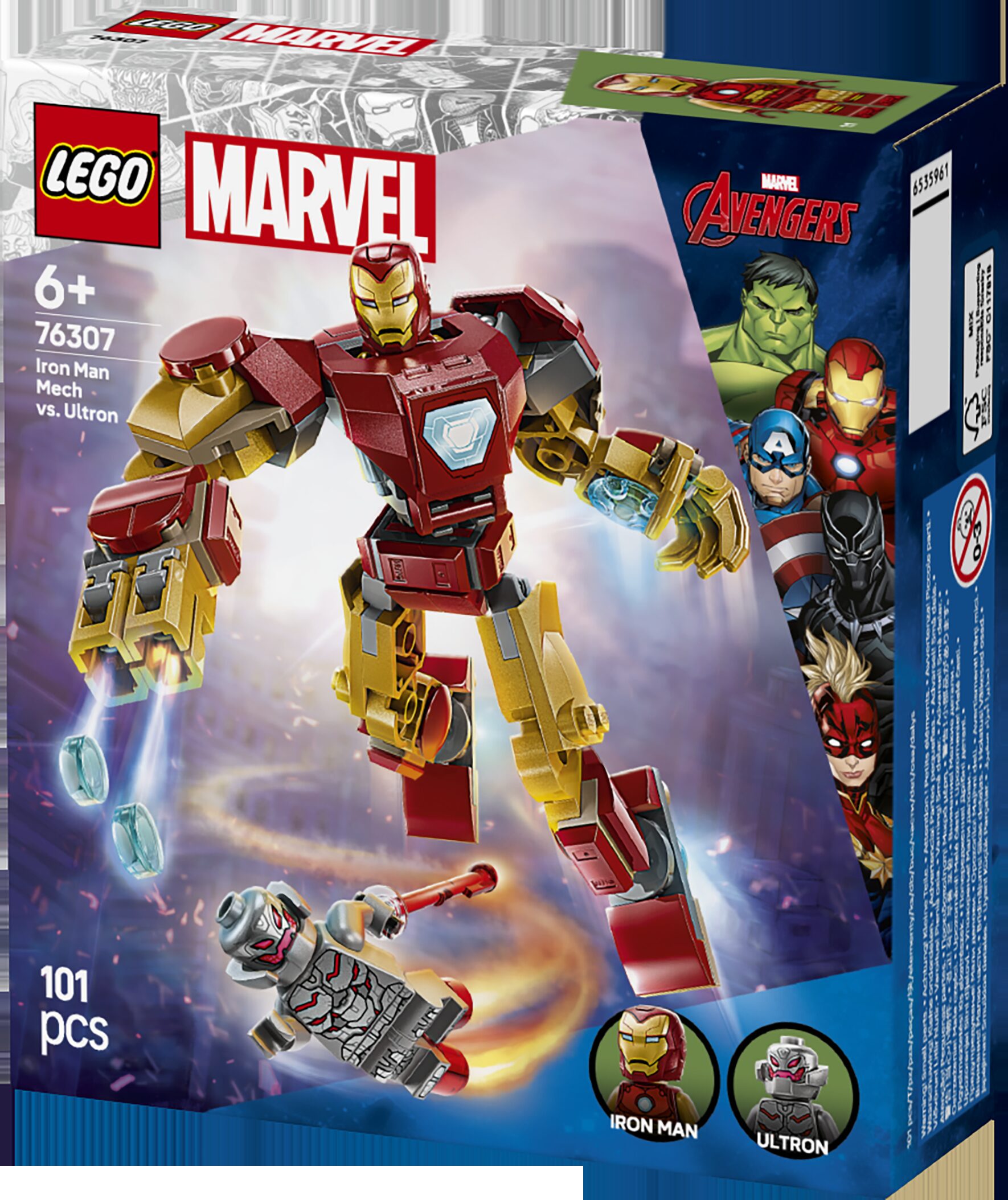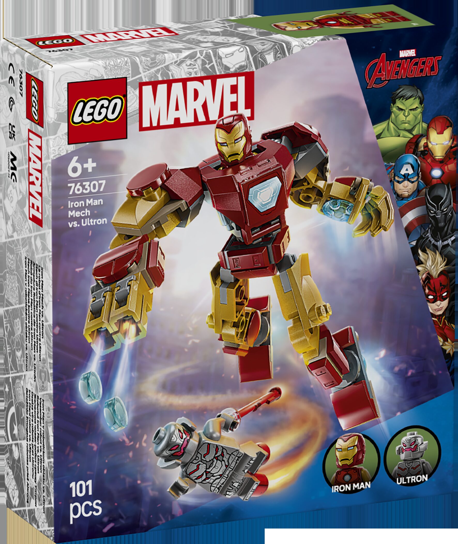 Mehanički Iron Man protiv Ultrona (76307) je akcijski složivi komplet iz linije LEGO® Marvel za djecu od 6 godina i stariju koja uživaju u igri sa superjunacima i slaganju pustolovnih igračaka. Komplet za igru s mehaničkom figurom iz linije LEGO Marvel uključuje 2 figurice: Iron Mana s kacigom koja se otvara i okretnom glavom s različitim izrazima lica te Ultrona s laserskom zrakom. Složivi robot ima pomične ruke, noge i prste, a u desnoj ruci drži pucač. U trupu koji se otvara nalazi se kabina za figuricu Iron Mana. Ako graditelji traže dodatnu digitalnu zabavu, mogu približavati i okretati trodimenzionalne modele i pratiti napredak u zabavnoj i intuitivnoj aplikaciji LEGO Builder.