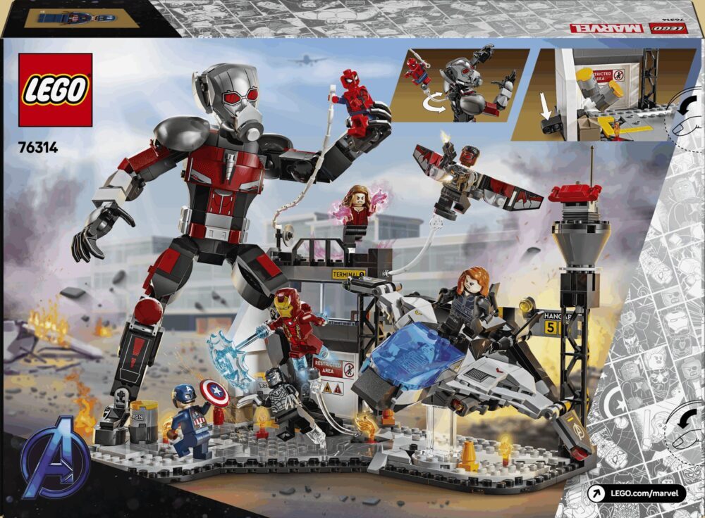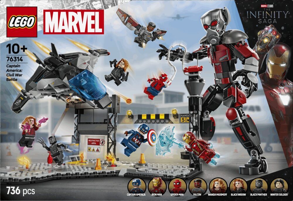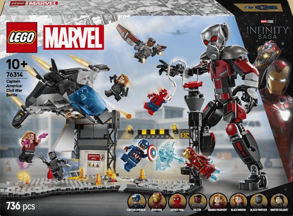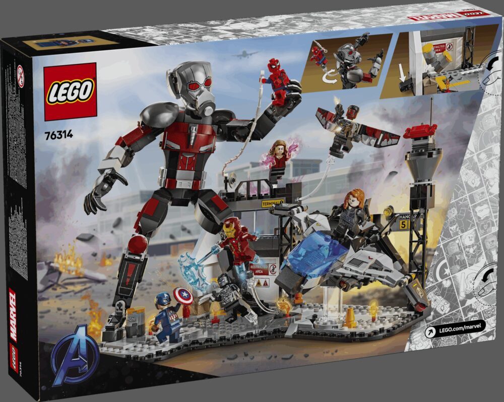 Bitka iz filma Kapetan Amerika: Građanski rat (76314) detaljna je složiva igračka iz linije LEGO® Marvei i može biti epski poklon za djecu od 10 godina i stariju. U LEGO kompletu za slaganje dobivate 9 figurica iz linije LEGO Marvel, letjelicu Quinjet i mnogo dodataka, pa djeca mogu odglumiti omiljene trenutke iz filma i krenuti na beskrajne maštovite pustolovine koje sami smisle ili izložiti model kako žele. Složivi komplet za igru nastao je po uzoru na prizor borbe u zračnoj luci iz filma Kapetan Amerika: Građanski rat kuće Marvel Studios. Uključuje 8 figurica, Captaina Americu, Winter Soldiera, Wandu, Falcona, Iron Mana, Spider-Mana, Black Widow i Black Panthera, s oružjem i dodacima, te Ant-Mana sa zglobovima visokog više od 24 cm. Letjelica Quinjet ima sklopiva krila i kabinu koja se otvara da bi u nju sjela figurica pilota. Borbenoj akciji dodatno doprinosi eksplozija bačve u zračnoj luci. Djeca mogu približavati i okretati modele u aplikaciji LEGO Builder dok slažu.