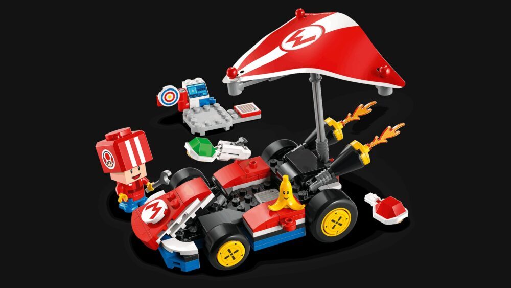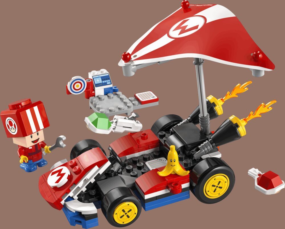 Toad (Pit Crew) traži ekipu s kojom će pripremiti Standard Kart za utrku! Uzmi francuski ključ s radne stanice, pregledaj vozilo pa uskoči na vozačko sjedalo i isprobaj kart. Juri pored Banane, bacaj oklope pa isprobaj Super Glider za klizanje! LEGO® Mario™, LEGO® Luigi™ ili LEGO® Peach™ (figure nisu dio kompleta) mogu voziti Standard Kart s tobom da pokrenete zvučne efekte driftanja i druge!