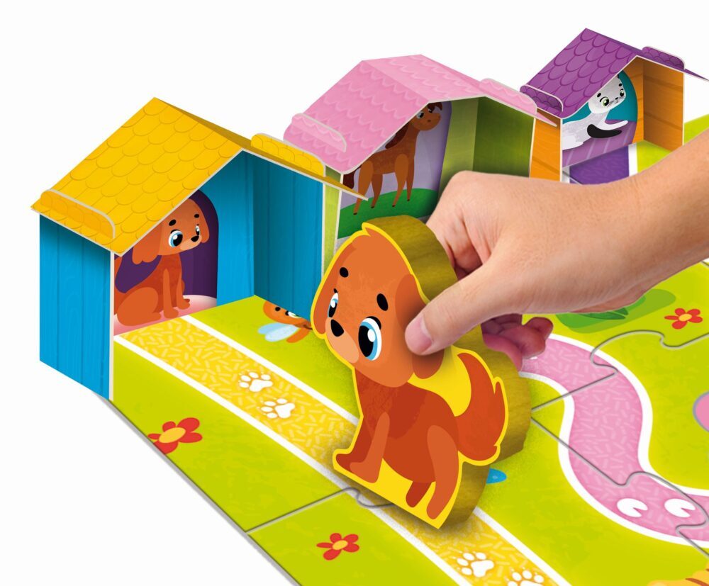 Igra sadrži puzzle podlogu, 5 drvenih životinja i 5 kućica za životinje. Ova edukativna igra slijedi Montessori metodu jer kroz igru dijete razvija opip i logičko razmišlajnje.