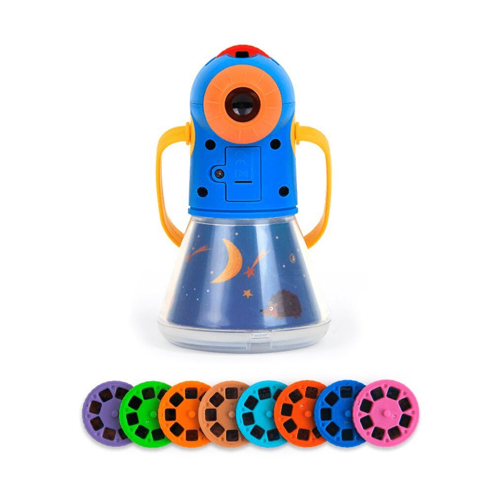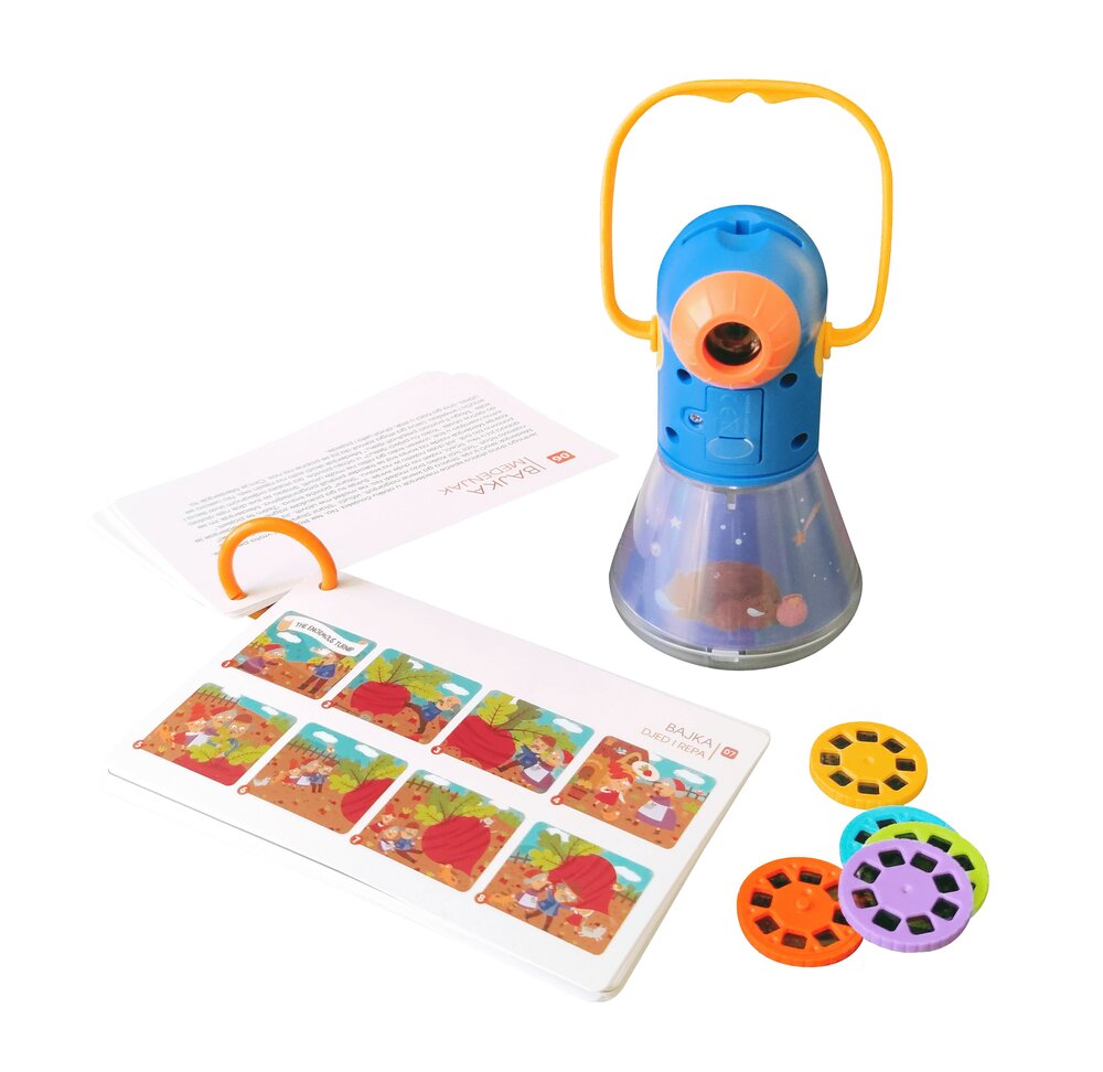 Prekrasna edukativna igračka za stvaranje uspomena iz djetinjstva i obiteljskog povezivanja! Dječji projektor Pričam ti priču projicira 8 prekrasnih slika bajki na zid ili strop. Osim projekcije slika bajki, može se koristiti i kao svjetiljka ili nježno noćno svjetlo s prikazom noćnog neba. Set sadrži 1 projektor i 8 pločica sa 8 slika bajki: Djed i repa, Dječak i vuk, Sretan princ, Pepeljuga, Pinokio, Palčica, Medenjak, Želim ići u svemir. U priloženoj knjižici bajke su prevedene na hrvatski jezik kako bi uz projicirane slike lakše pričali bajke svojem mališanu.
