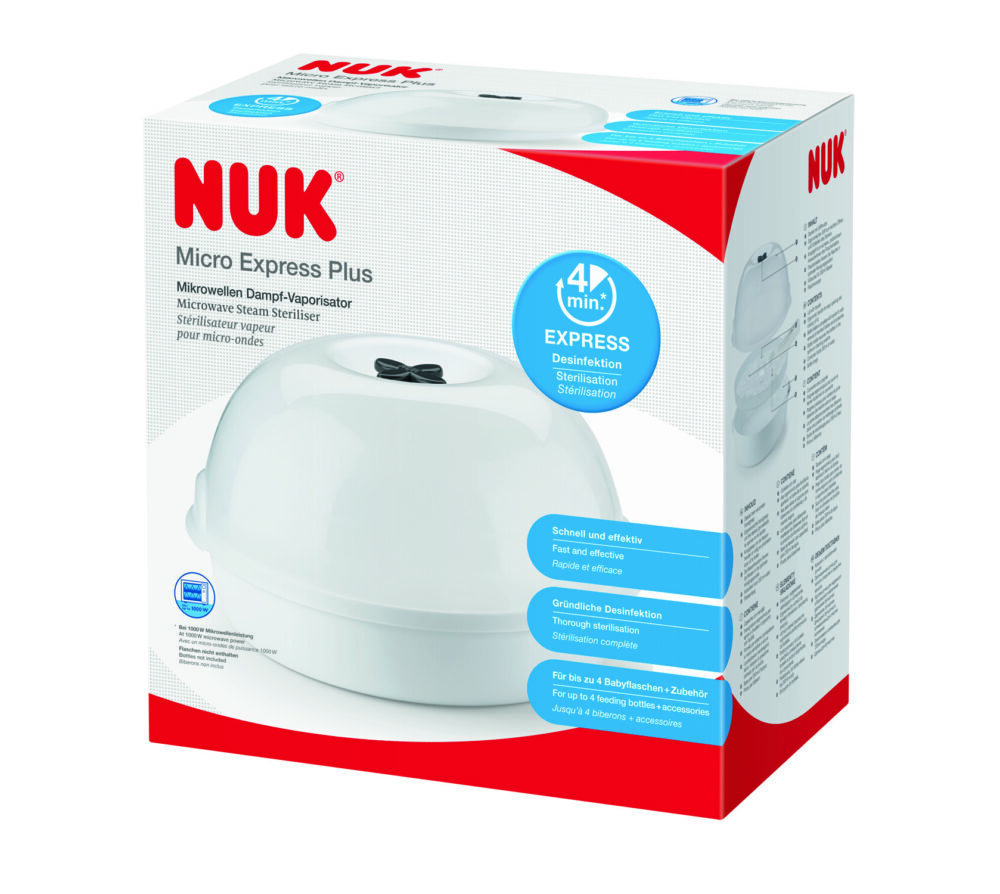 Mikrovalni parni sterilizator NUK Micro Express Plus, za do 4 boce i pribor, brz je, učinkovit i temeljit. Želite biti sigurni da su bočice i dudice vašeg djeteta zaista higijenski čiste? Uz NUK Micro Express Plus sterilizator za bočice i dudice to će uvijek biti.
