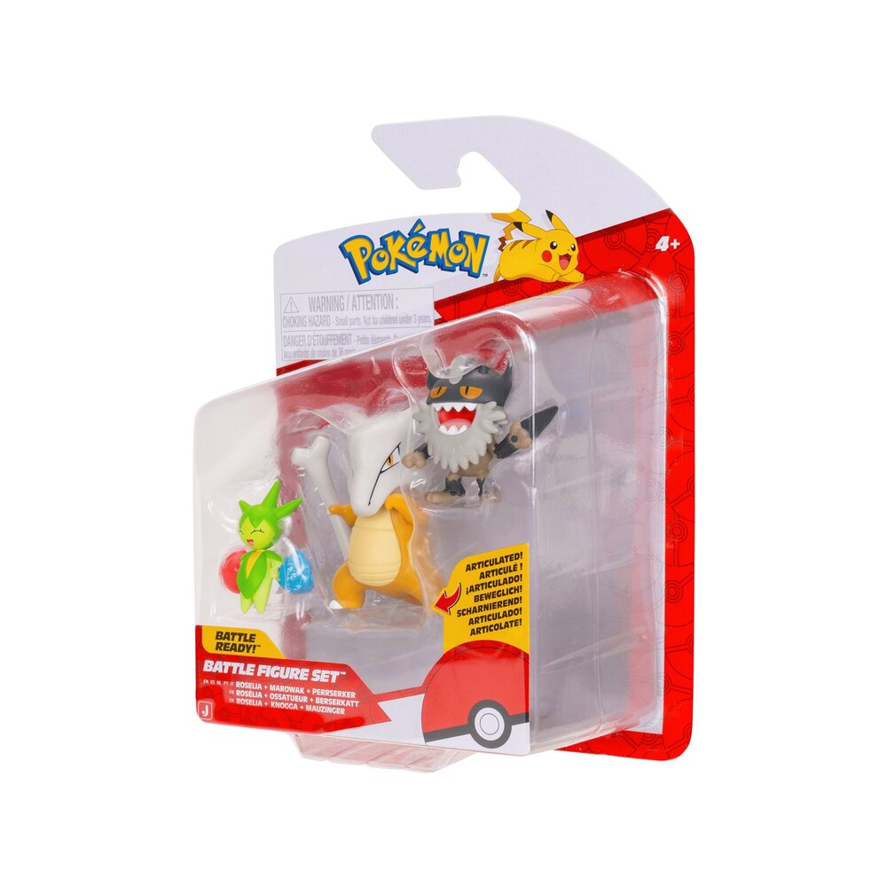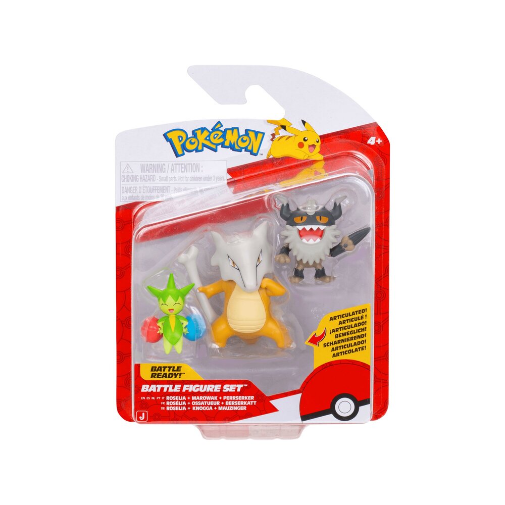 Trostruki set Battle Figure sadrži tri moćna Pokémona – Roselia, Marowak i Perrserker – spremne za akciju, borbu i kolekcionarsku igru! Figurice su izrađene s bogatim detaljima, a Marowak i Perrserker imaju pomične dijelove za još više zabave i realističnih dvoboja. Odličan izbor za sve male trenere koji žele proširiti svoju Pokémon kolekciju! Sadržaj pakiranja: 3 Pokémon figure. Visina figura: od 4 do 7 cm. Preporučena dob: 4+ godine.