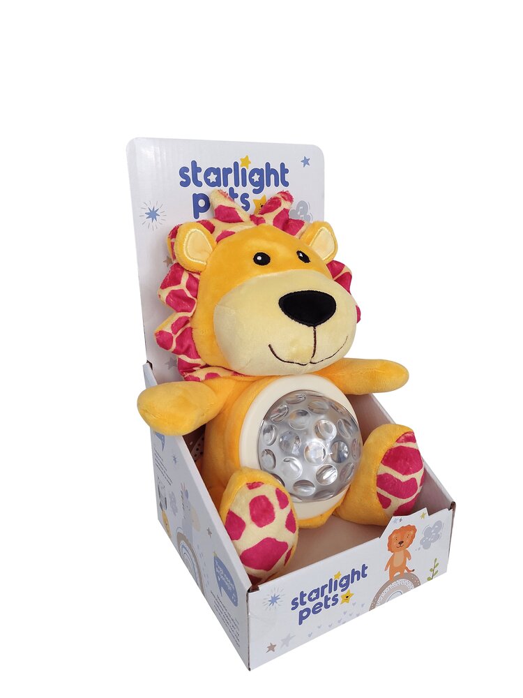 Plišani prijatelji za laku noć! Starlight Pets lavić je interaktivna plišana igračka koja svijetli zvjezdanim svjetlom u različitim bojama dok svira melodiju “Blistaj, blistaj, zvijezdo mala”. Kada djeca krenu na spavanje, Starlight Pets interaktivna plišana igračka će ih opustiti i uspavati. Pritisnite kristalni trbuščić na igrački, on će zasvijetliti i melodija će zasvirati. Dvije funkcije: 1) Noćna svjetiljka (bijelo svijetlo) 2) Projicira zvijezde u bojama na zidove sobe dok svira laganu uspavanku. Za rad su potrebne 3 AA 1,5V baterije (uključene uz proizvod).