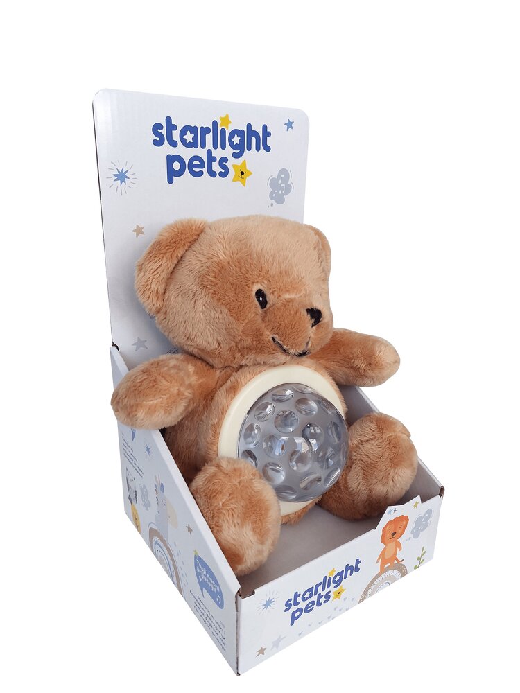 Plišani prijatelji za laku noć! Starlight Pets medvjedić je interaktivna plišana igračka koja svijetli zvjezdanim svjetlom u različitim bojama dok svira melodiju “Blistaj, blistaj, zvijezdo mala”. Kada djeca krenu na spavanje, Starlight Pets interaktivna plišana igračka će ih opustiti i uspavati. Pritisnite kristalni trbuščić na igrački, on će zasvijetliti i melodija će zasvirati. Dvije funkcije: 1) Noćna svjetiljka (bijelo svijetlo) 2) Projicira zvijezde u bojama na zidove sobe dok svira laganu uspavanku. Za rad su potrebne 3 AA 1,5V baterije (uključene uz proizvod).