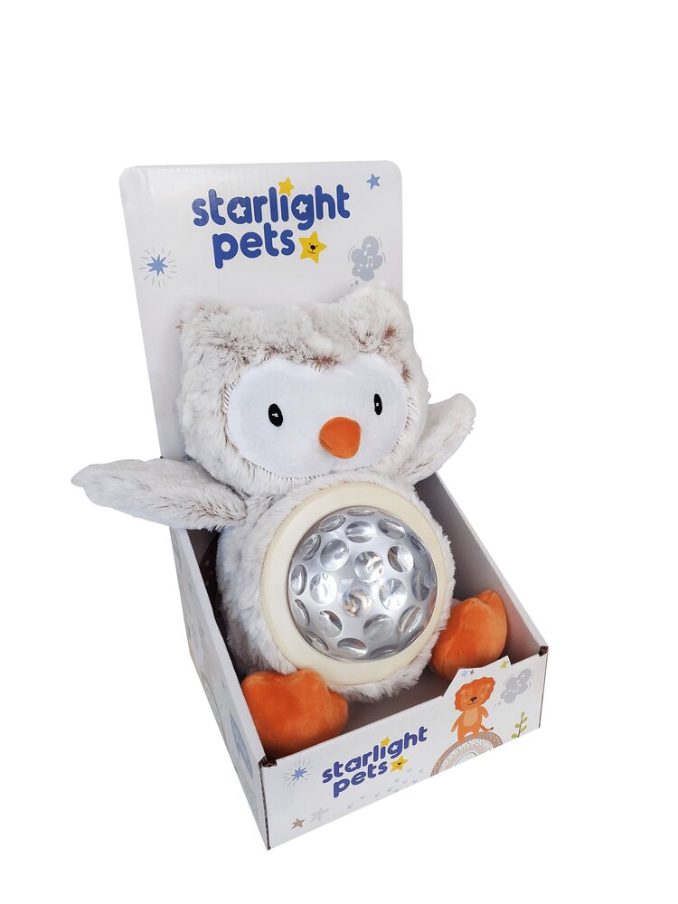 Plišani prijatelji za laku noć! Starlight Pets sova je interaktivna plišana igračka koja svijetli zvjezdanim svjetlom u različitim bojama dok svira melodiju “Blistaj, blistaj, zvijezdo mala”. Kada djeca krenu na spavanje, Starlight Pets interaktivna plišana igračka će ih opustiti i uspavati. Pritisnite kristalni trbuščić na igrački, on će zasvijetliti i melodija će zasvirati. Dvije funkcije: 1) Noćna svjetiljka (bijelo svijetlo) 2) Projicira zvijezde u bojama na zidove sobe dok svira laganu uspavanku. Za rad su potrebne 3 AA 1,5V baterije (uključene uz proizvod).