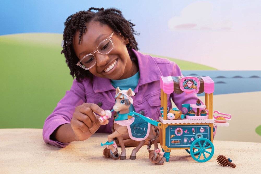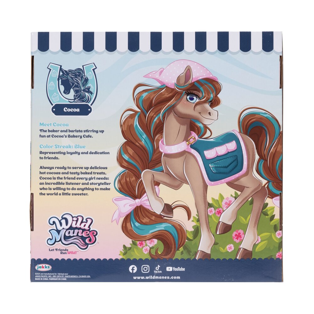 Wild Manes je linija igračaka i animirana serija koja prikazuje svijet šarenih konjića s jedinstvenim stilovima, smještenih u maštovito okruženje zvano Mane Street. Igračke dolaze s pokretnim dućanima i dodacima za igru uloga, a likovi poput Cherie, Bailey i Zoey poznati su po osebujnim frizurama i željom za zabavnim avanturama. Epizode serije dostupne su na službenom YouTube kanalu. Cocoa je uvijek tu za prijatelje – s toplim kakaom i otvorenim uhom, spremna uljepšati nečiji dan. Njezin mobilni kafić prepun je ukusnih napitaka i slastica, a uz set od 17 dodataka možeš joj pomoći u pripremi najdražih napitaka za sve koji navrate na razgovor i druženje. Figura ima nekoliko pomičnih točki te se može postaviti u razne poze za dinamičnu igru. Set sadrži 1x figura konja, dodaci za igru. Preporučena dob: 3+.