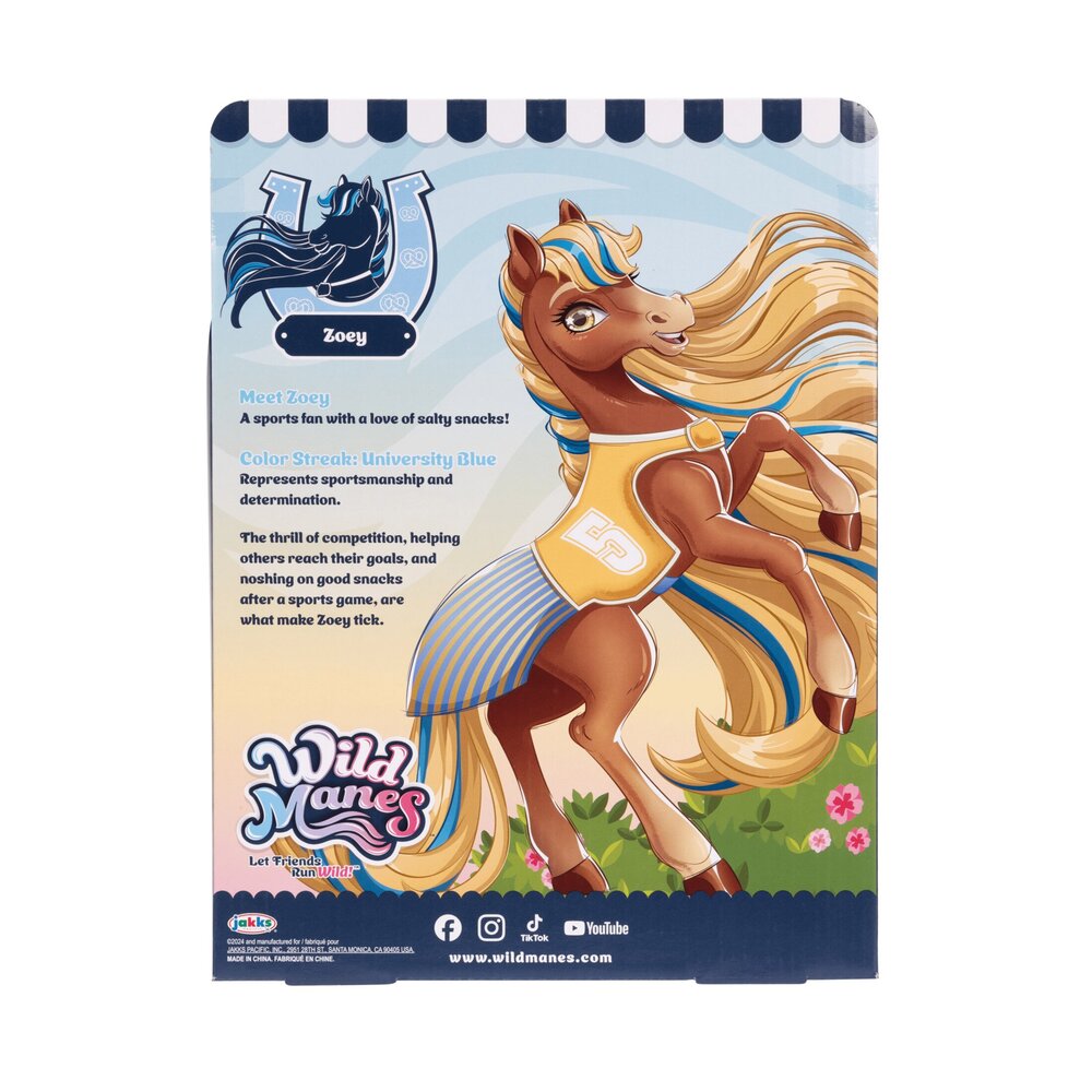 Wild Manes je linija igračaka i animirana serija koja prikazuje svijet šarenih konjića s jedinstvenim stilovima, smještenih u maštovito okruženje zvano Mane Street. Igračke dolaze s pokretnim dućanima i dodacima za igru uloga, a likovi poput Cherie, Bailey i Zoey poznati su po osebujnim frizurama i željom za zabavnim avanturama. Epizode serije dostupne su na službenom YouTube kanalu. Ovaj sortni artikl nudi tri različita konjića – Zoey, Lana i Sundae – od kojih svaki dolazi s tematskim dodacima poput pereca, krafni i sladoleda. Svaka figura ima pomične točke te se može postaviti u razne poze za dinamičnu igru. Unikatni detalji ovog seta potiču kreativnu igru i stvaranje vlastitih maštovitih priča. Set sadrži 1x figura konja, dodaci za igru. Preporučena dob: 3+.