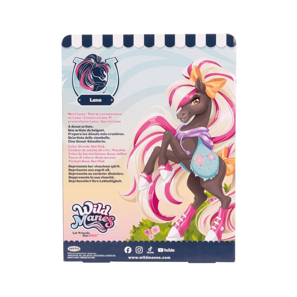 Wild Manes je linija igračaka i animirana serija koja prikazuje svijet šarenih konjića s jedinstvenim stilovima, smještenih u maštovito okruženje zvano Mane Street. Igračke dolaze s pokretnim dućanima i dodacima za igru uloga, a likovi poput Cherie, Bailey i Zoey poznati su po osebujnim frizurama i željom za zabavnim avanturama. Epizode serije dostupne su na službenom YouTube kanalu. Lana obožava rano buđenje i početak dana uz miris svježe pečenih krafni svih oblika i veličina. Pomozi joj pripremiti slasne zalogaje za prijatelje s plaže uz ovaj set koji uključuje figuru s nekoliko pomičnih točki za postavljanje u razne poze te 12 dodataka za maštovitu igru. Set sadrži 1x figura konja, dodaci za igru. Preporučena dob: 3+.