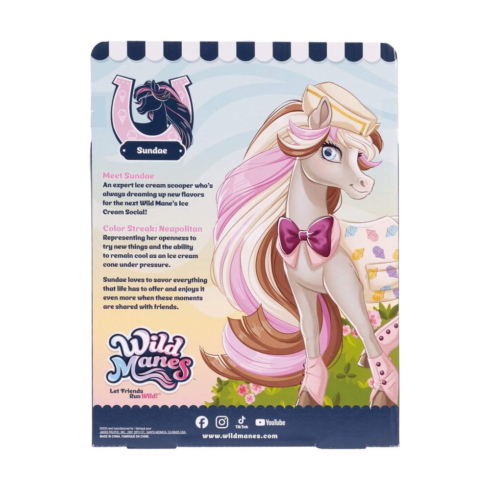 Wild Manes je linija igračaka i animirana serija koja prikazuje svijet šarenih konjića s jedinstvenim stilovima, smještenih u maštovito okruženje zvano Mane Street. Igračke dolaze s pokretnim dućanima i dodacima za igru uloga, a likovi poput Cherie, Bailey i Zoey poznati su po osebujnim frizurama i željom za zabavnim avanturama. Epizode serije dostupne su na službenom YouTube kanalu. Sundae uvijek mašta o novim okusima sladoleda koji će ju rashladiti u vrućim ljetnim danima. Ovaj set sadrži 14 dijelova za maštovitu i dugotrajnu igru, pomoću kojih joj i ti možeš pomoći u pripremi ukusnih sladolednih delicija. Figura konjića ima nekoliko pomičnih točki te se može postaviti u razne poze. Set je idealan za djecu koja prate Wild Manes avanture. Set sadrži 1x figura konja, dodaci za igru. Preporučena dob: 3+.