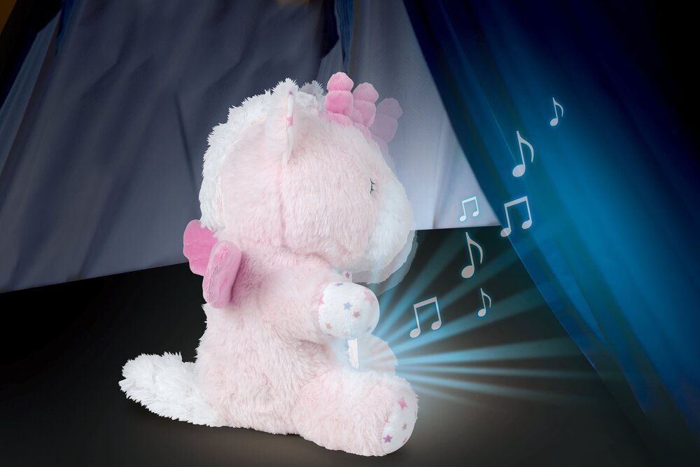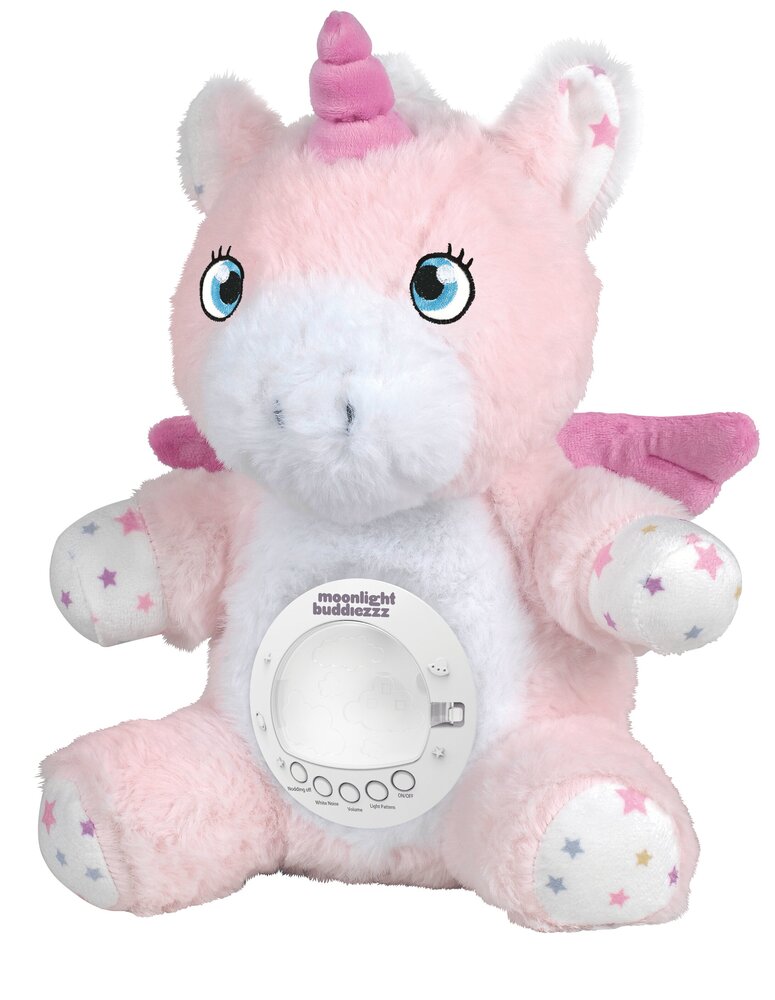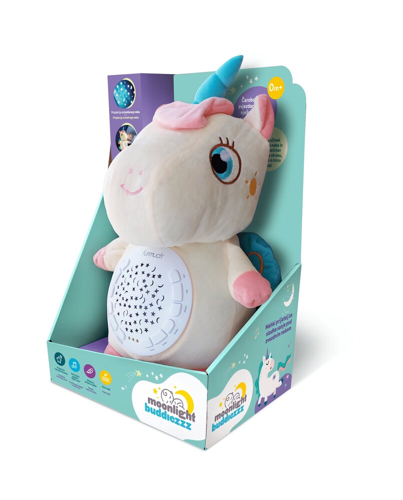 Moonlight Buddiezzz su jedini plišanci za bebu koji će vam zaista trebati! Ovi medeni plišanci dizajnirani su kako bi svojom pojavom i nježnim izgledom umirili bebu, a tehničke mogućnosti uređaja koji je ugrađen u trbuščić igračke pomoći će i najtežim slučajevima nervoze zbog kolika ili izbijanja zubića. Uređaj reproducira deset umirujućih melodija uspavanki, a s mogućnošću odabira pet razina glasnoće uvijek ćete moći reprodukciju prilagoditi potrebama vaše bebe. Uređaj emitira bijeli šum, među mamama omiljen zvuk koji bebe vole, a pomaže pri zatomljavanju vanjskih ometajućih zvukova. Uz pomoć mjerača vremena možete podesiti duljiu reprodukcije uređaja prema svojim potrebama, a dodatnu draž ovoj lijepoj plišanoj igrački daje i LED svjetlo koje svojim blagim radom pridonosi umirujućim osjećajima. Uređaj ima i opciju prikaza zvjezdanog neba koje će dodatno ukrasiti ionako lijepu atmosferu oko bebine kolijevke. Ova plišana igračka iznimno se lako održava – jednostavno izvadite uređaj iz trbuščića igračke te operite plišani dio kako bi uvijek bio potpuno higijenski prikladan za vaše najmanje. Igračke su dizajnirane u nekoliko primamljivih životinjskih likova, visine oko 30 cm. Za ispravan rad uređaja potrebne su 3x AAA baterije (nisu uključene uz proizvod). Preporučena dob: 0+.