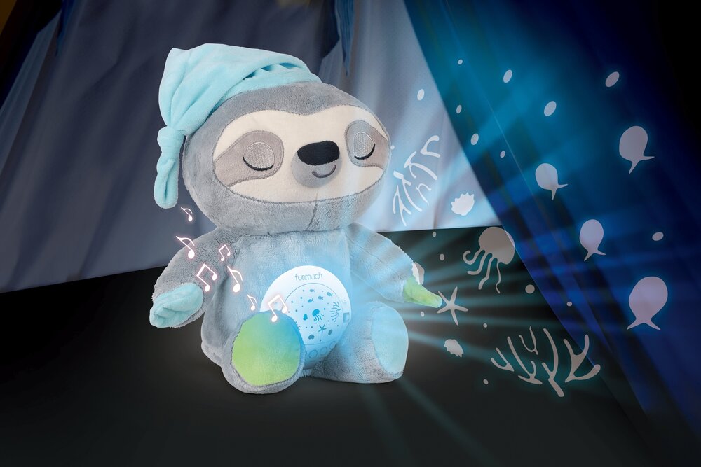 Moonlight Buddiezzz su jedini plišanci za bebu koji će vam zaista trebati! Ovaj simpatični ljenjivac ima detalje veselih boja koje odmah privlače pažnju, a njegov nježan izgled i meki materijal osiguravaju osjećaj sigurnosti i ugode već od prvog dana života. U trbuščiću plišanca nalazi se uređaj koji reproducira nekoliko različitih melodija uspavanki, uključujući i popularni bijeli šum – zvuk koji pomaže bebi da lakše utone u san zatomljujući vanjske zvukove. Moguće je birati između nekoliko razina glasnoće kako bi glazba uvijek bila prilagođena potrebama vaše bebe. Ljenjivac također svijetli umirujućim LED svjetlom te projicira prekrasne prizore na strop, stvarajući opuštajuću atmosferu u dječjoj sobici. Posebna funkcija nježnog njihanja dodatno doprinosi uspavljivanju jer oponaša efekt ljuljuškanja. Zahvaljujući mjeraču vremena, možete jednostavno odabrati trajanje rada uređaja. Plišani dio se lako održava – samo izvadite elektronički modul i operite igračku. Uređaj radi na 3x AAA baterije (nisu uključene). Visina igračke je oko 30 cm. Preporučena dob: 0+.