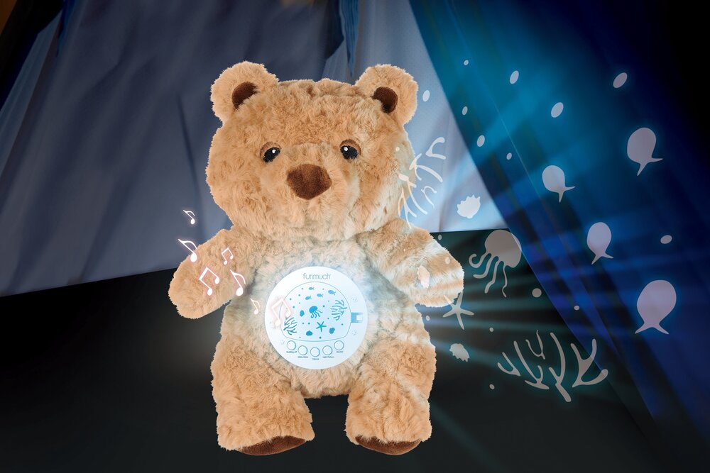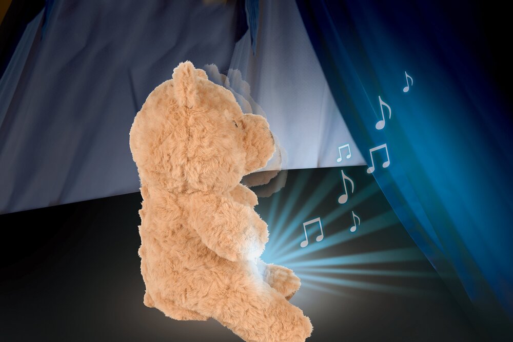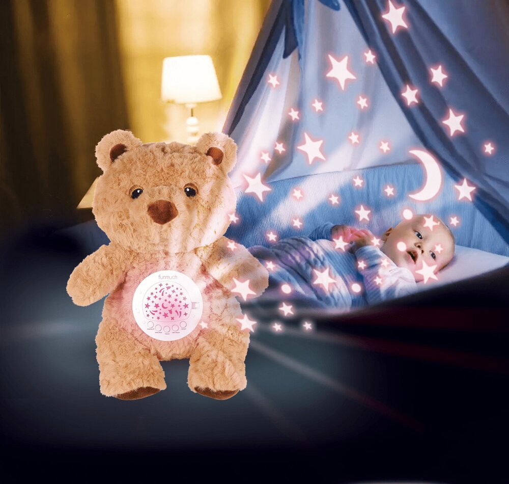 Moonlight Buddiezzz su jedini plišanci za bebu koji će vam zaista trebati! Ovog simpatičnog medu krasi klasičan izgled koji osvaja srce djeteta na prvi dodiri, a njegov meki materijal osigurava osjećaj sigurnosti i ugode. U trbuščiću plišanca nalazi se uređaj koji reproducira nekoliko različitih melodija uspavanki, uključujući i popularni bijeli šum – zvuk koji pomaže bebi da lakše utone u san zatomljujući vanjske zvukove. Moguće je birati između nekoliko razina glasnoće kako bi glazba uvijek bila prilagođena potrebama vaše bebe. Medo također svijetli umirujućim LED svjetlom te projicira prekrasne prizore na strop, stvarajući opuštajuću atmosferu u dječjoj sobici. Posebna funkcija nježnog njihanja dodatno doprinosi uspavljivanju jer oponaša efekt ljuljuškanja. Zahvaljujući mjeraču vremena, možete jednostavno odabrati trajanje rada uređaja. Plišani dio se lako održava – samo izvadite elektronički modul i operite igračku. Uređaj radi na 3x AAA baterije (nisu uključene). Visina igračke je oko 30 cm. Preporučena dob: 0+.